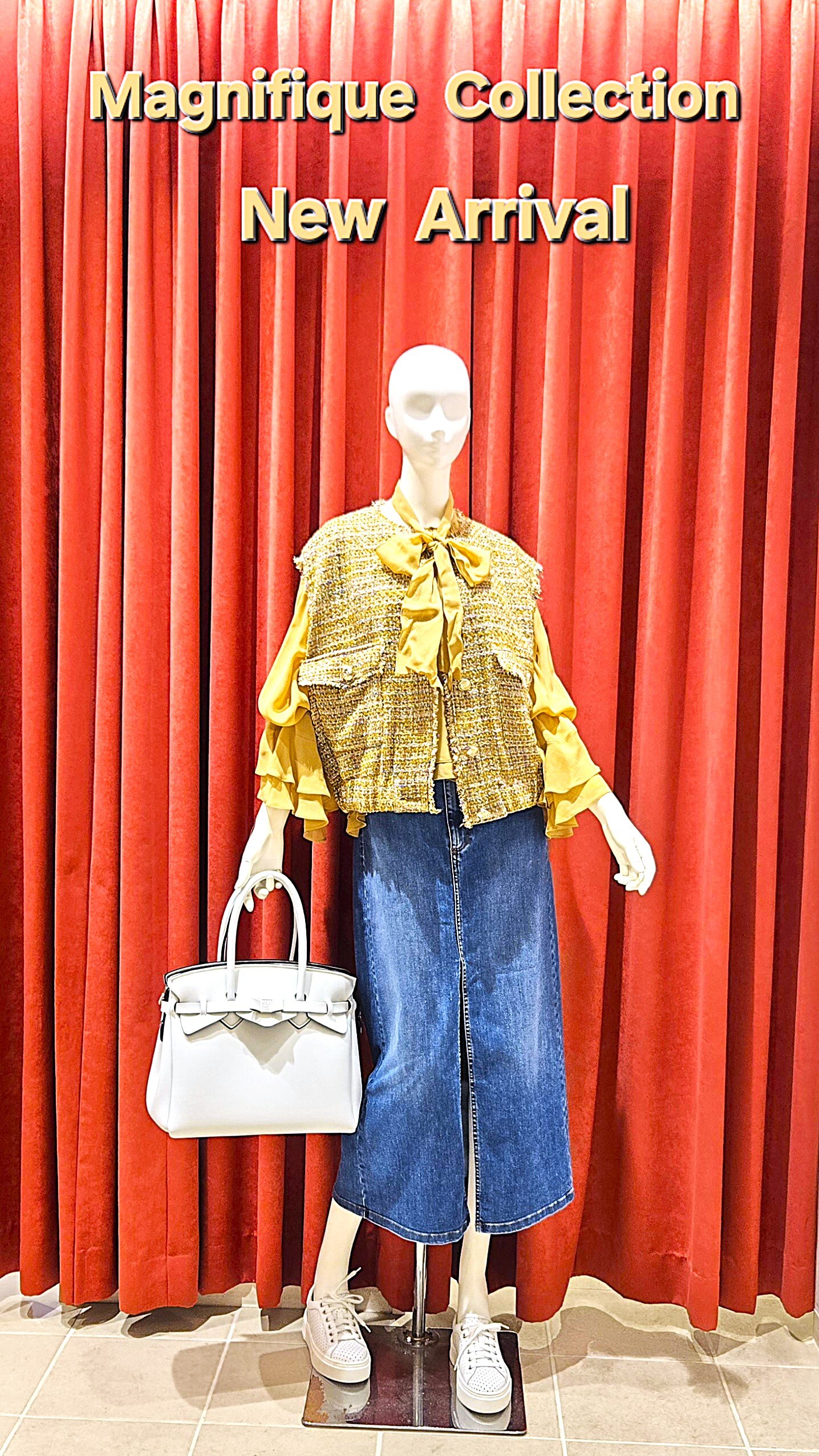 定番化してきたツィード素材のジレに、同色のシフォンブラウスをチョイス。