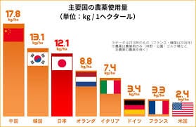 2024年の農薬使用量に関する世界ランキングは、国連食糧農業機関(FAO)の統計データに基づくと、中国と日本が上位を争う状況です。特に、農地1ヘクタールあたりの農薬使用量で比較すると、中国が約17kg、韓国が13kg、日本が約12kgと、ほぼ同レベルの数値で、世界的に見ても非常に高いレベルにあることがわかります。
