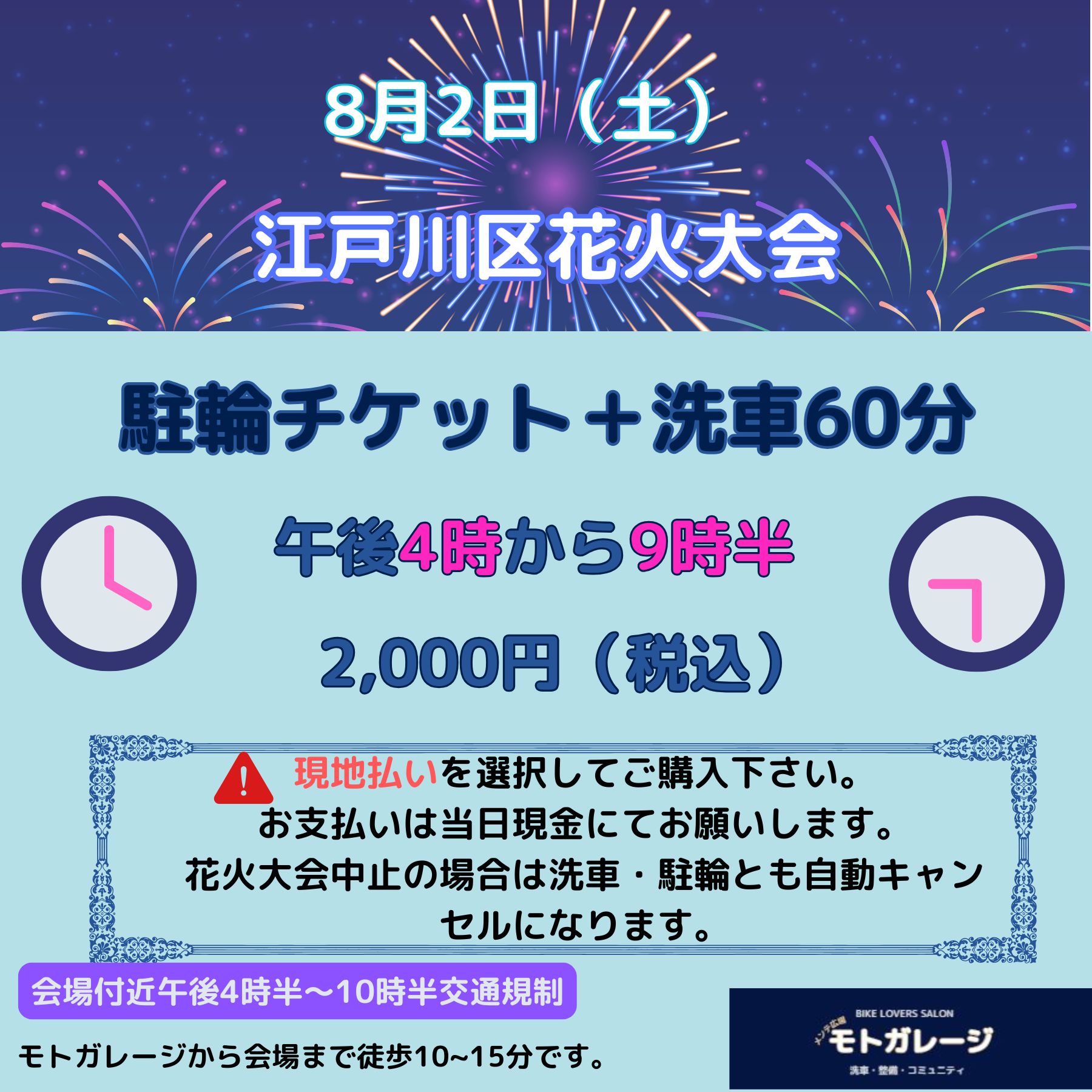 キャンセルの場合はなるべく早めにご連絡ください。キャンセル料はかかりません。キャンセルされた場合と花火大会が中止になった場合は、セットの洗車60分も無効になります。