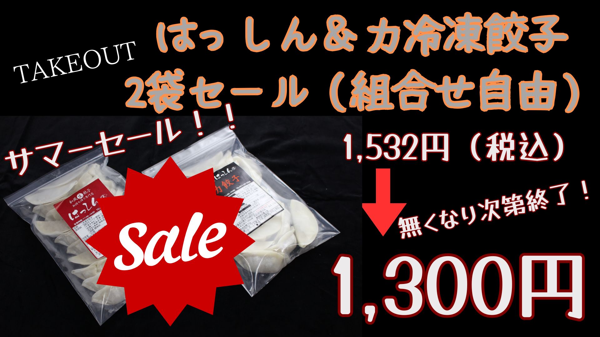対象商品は「冷凍はっしん餃子」「冷凍力餃子」の2種類。2袋ご購入で税込1300円にて販売!