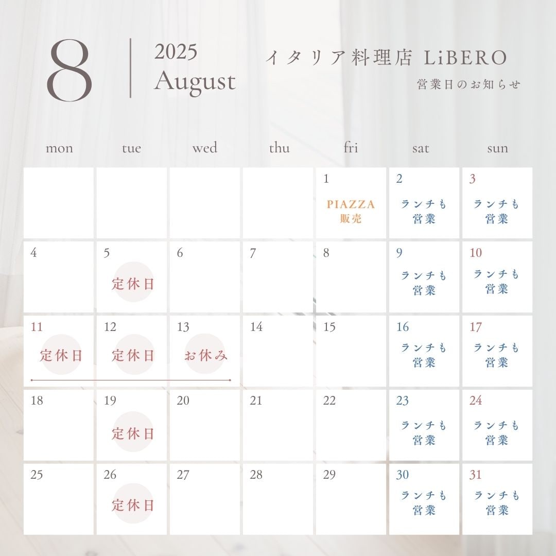 ■8月のお休みは毎週火曜日、第2月曜日、13日(水)です。