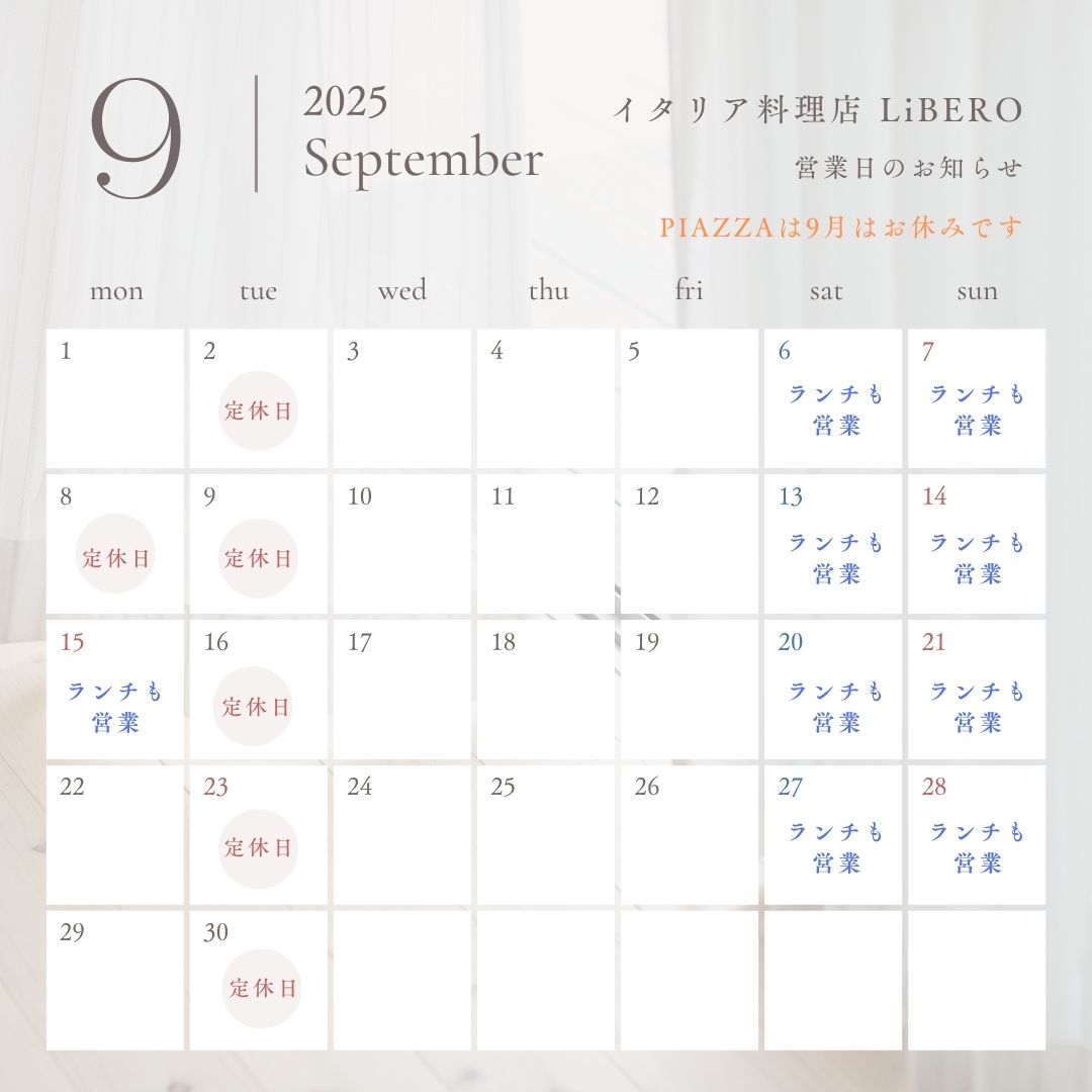 ■9月のお休みは毎週火曜日、第2月曜日です。