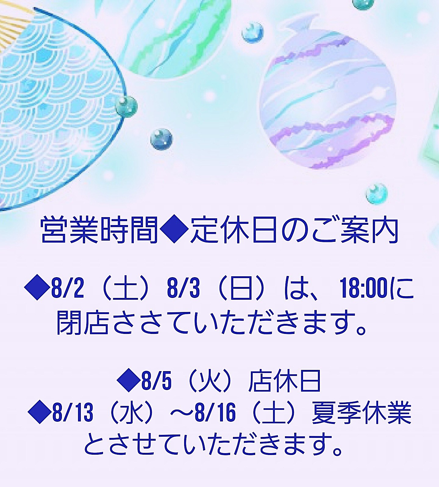 ♡ 今月の営業時間ならびに店休日のご案内です。 長岡祭り・お盆などに伴い、営業時間の変更ならびに夏季休業などがございます。お確かめの上ご来店くださいませ🙇⤵️