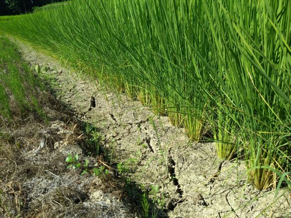 田圃は水不足で深いヒビ割れをしているので、ポンプアップの用水では水が田んぼの全部に行き渡りません。