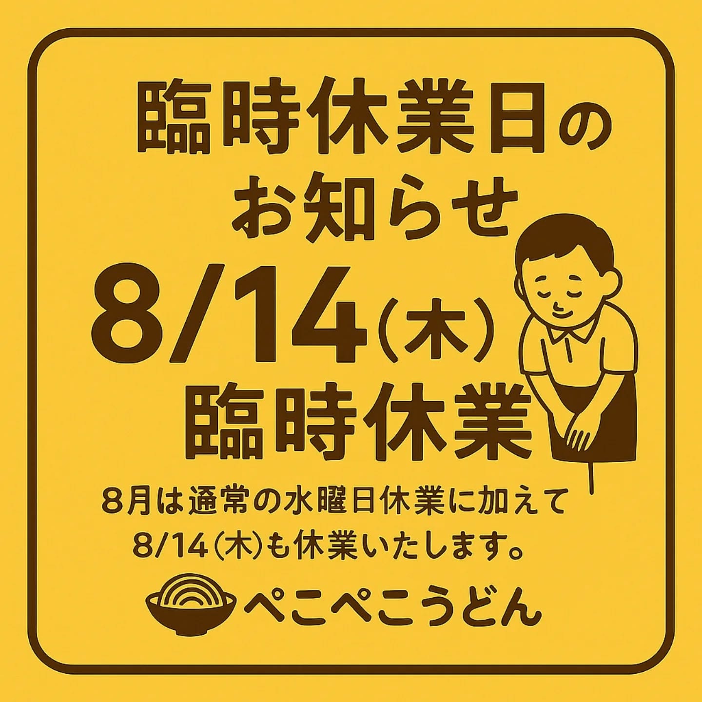 8月の臨時休業日のお知らせですこんにちはぺこぺこうどんです!8/14(木)は昼夜ともにお休みとさせていただきますご来店を予定されていた方には大変ご迷惑をおかけいたしますが、何卒よろしくお願いいたします毎日暑いですが、ぺこぺこうどんは店内を涼し〜くして皆様をお待ちしております(今年からクーラーを新しくしました!)#ぺこぺこうどん #大阪うどん #大阪グルメ #森ノ宮グルメ #大阪城公園 #関西グルメ #うどんスタグラム #麺活 #万博 #自家製麺 #うどん #緑橋グルメ