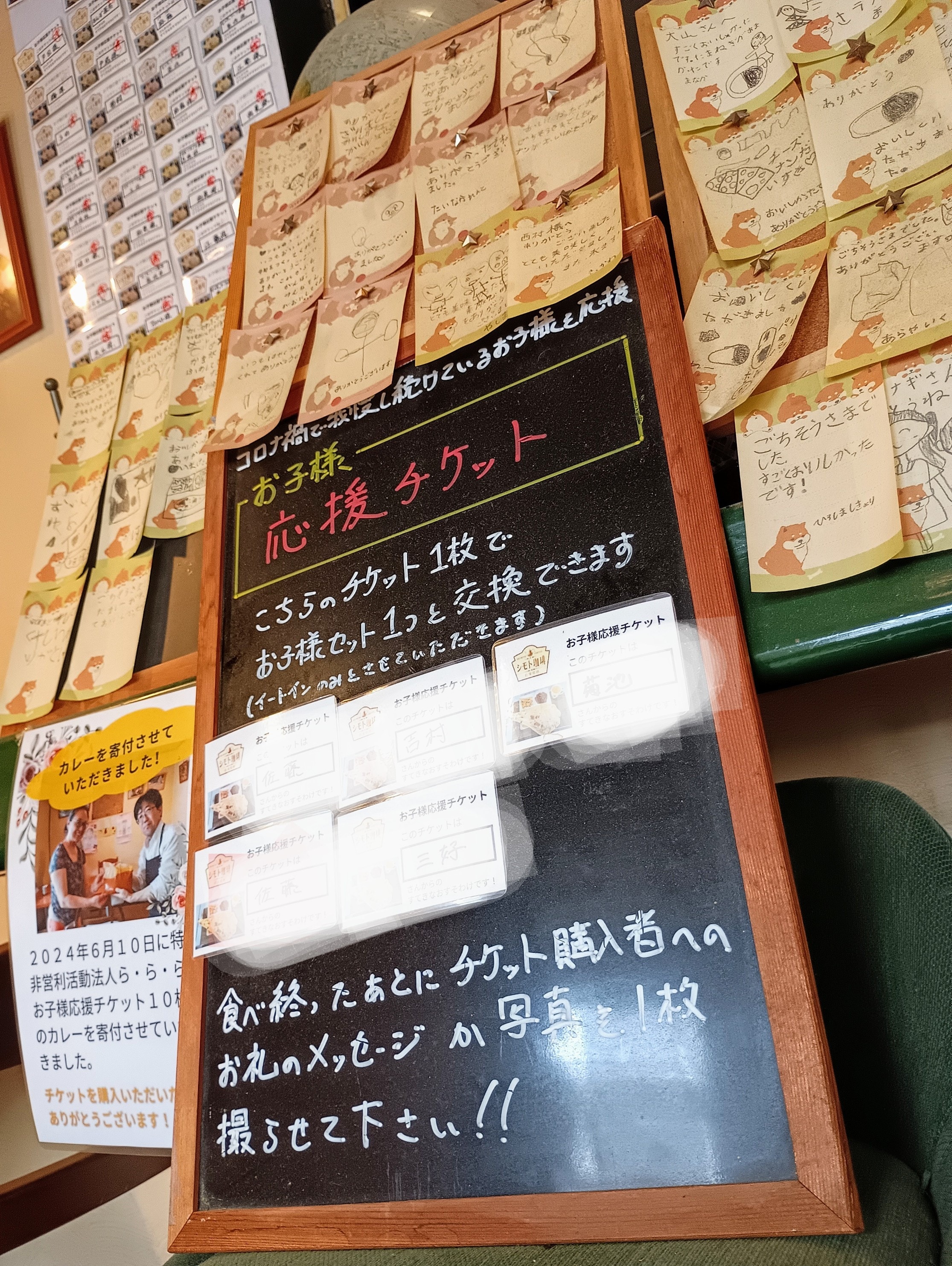 昨年よりボードに貼り切れないチケットが10枚貯まりましたらその分のカレーを作り、世田谷区にある楽ちん堂カフェに寄付させていただいております。