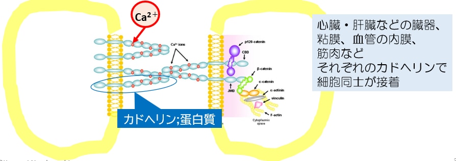 皮膚なら皮膚の細胞同士のカドヘリンが接続します。