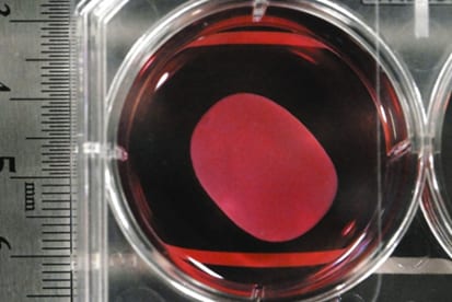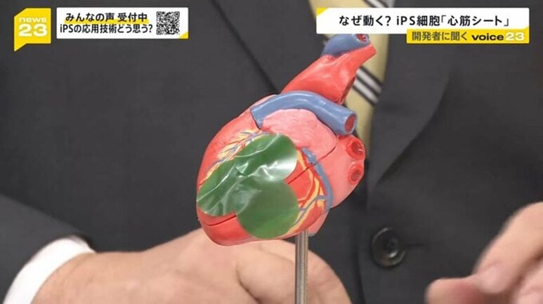 同様に、iPS細胞由来の心筋シート(薄い円盤状)が
