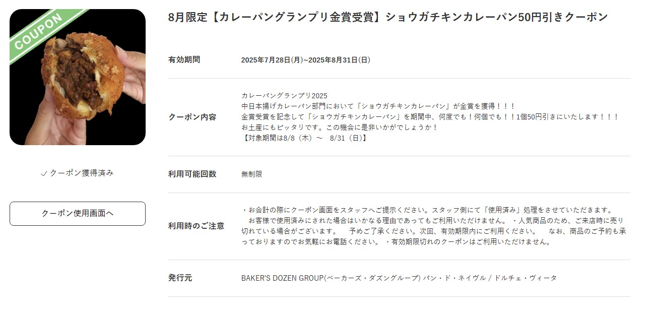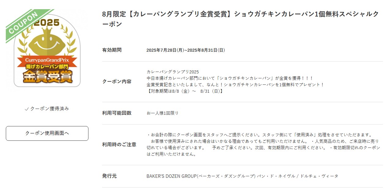 8月限定「カレーパングランプリ金賞受賞」したショウガチキンカレーパンのクーポン紹介