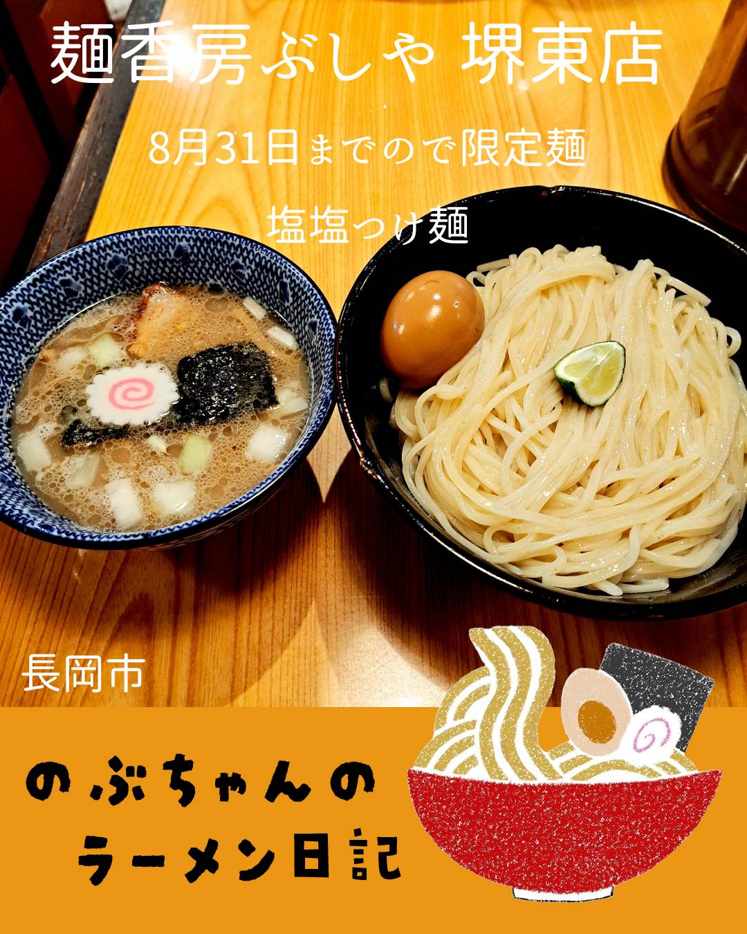 本日は暑い夏を「美味しい夏らしいつけ麺を食べて乗り切ろう!!」と言うことで【麺香房ぶしや】の8月31日までの限定麺、「塩塩つけ麺」のご紹介です✨