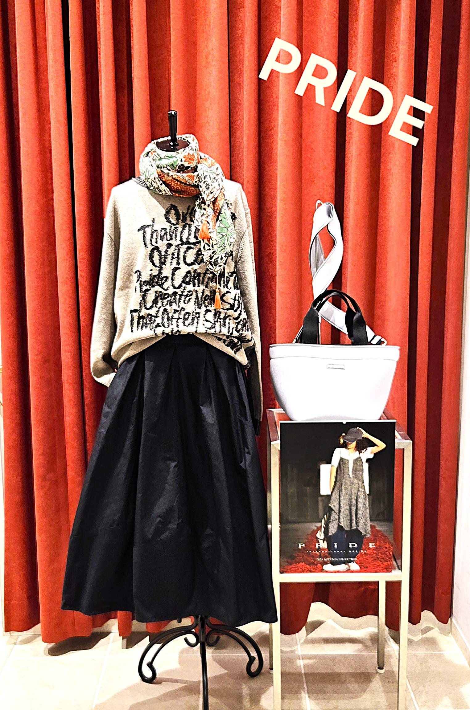 ♡ デザインは至ってベーシックなコットンセーターに、PRIDE(プライド)のメッセージ? を込めて…あるのかどうなのか? ちょっぴりハードな雰囲気にタフタのスカートで大人の甘さをプラスして、秋のスタートにピッタリなオススメコーディネート💗