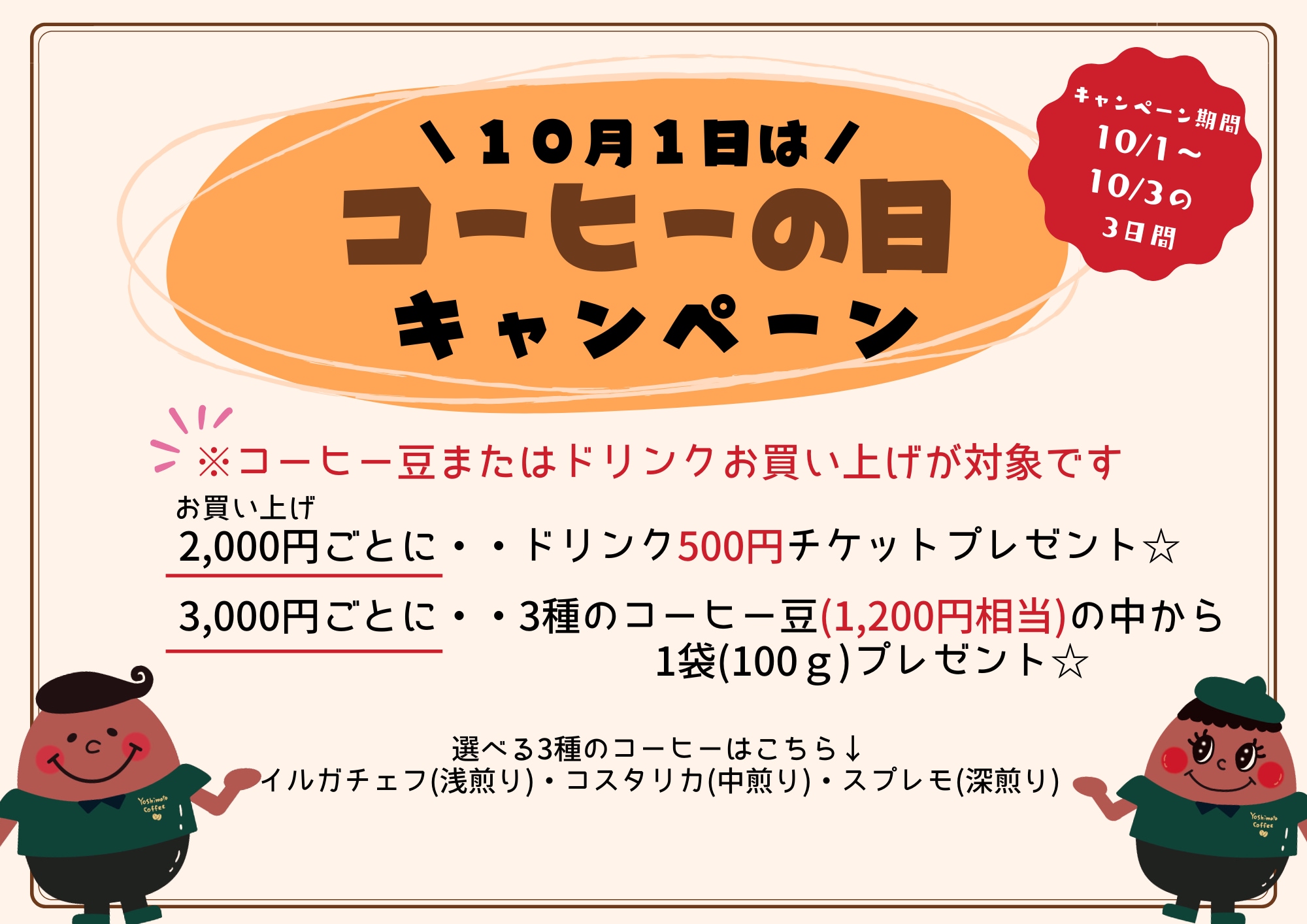 10月1日の「コーヒーの日」を記念して、10月1日から10月3日の3日間特別なキャンペーンをご用意しました!