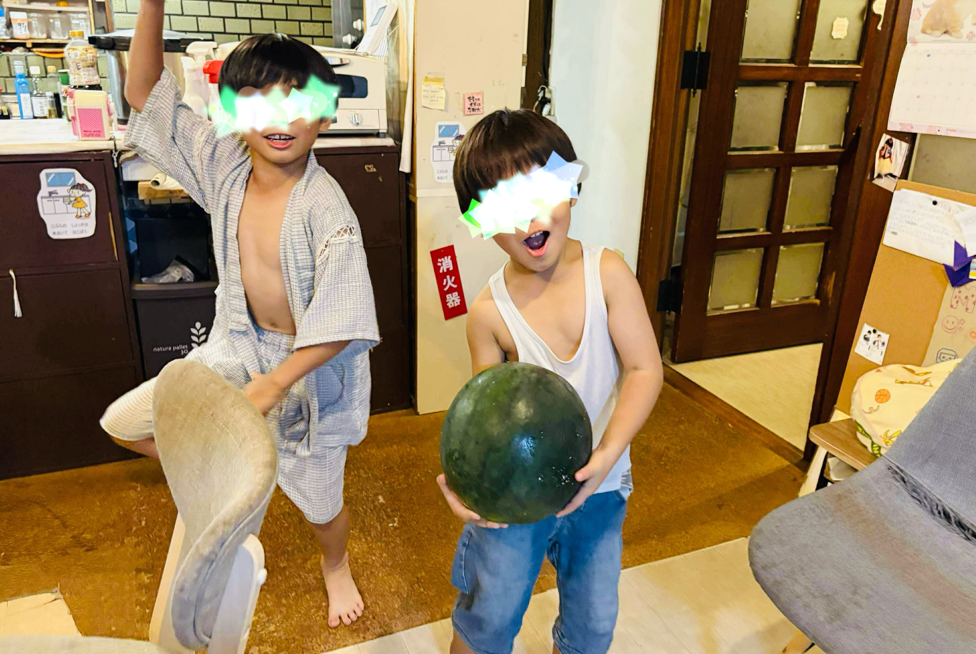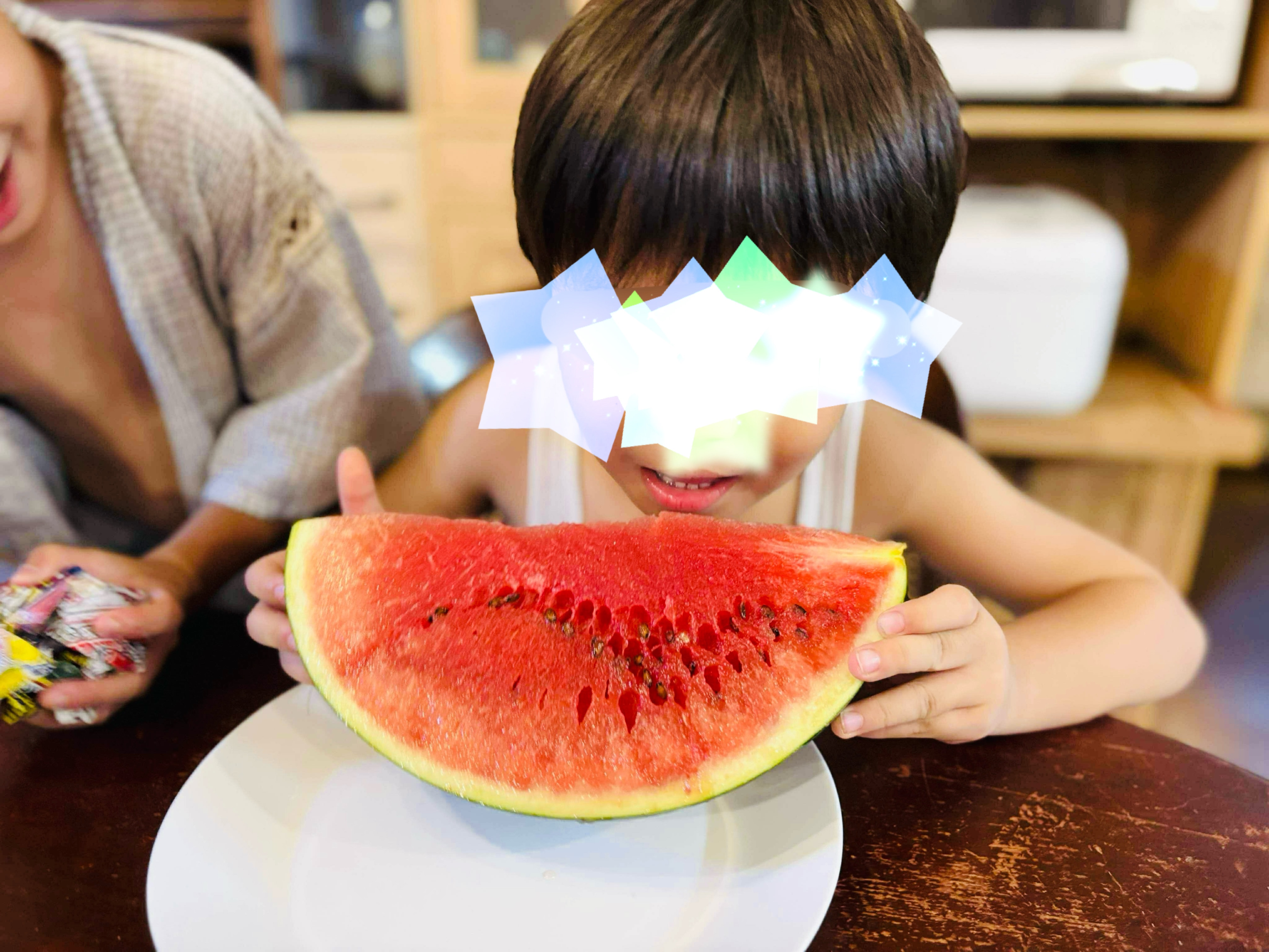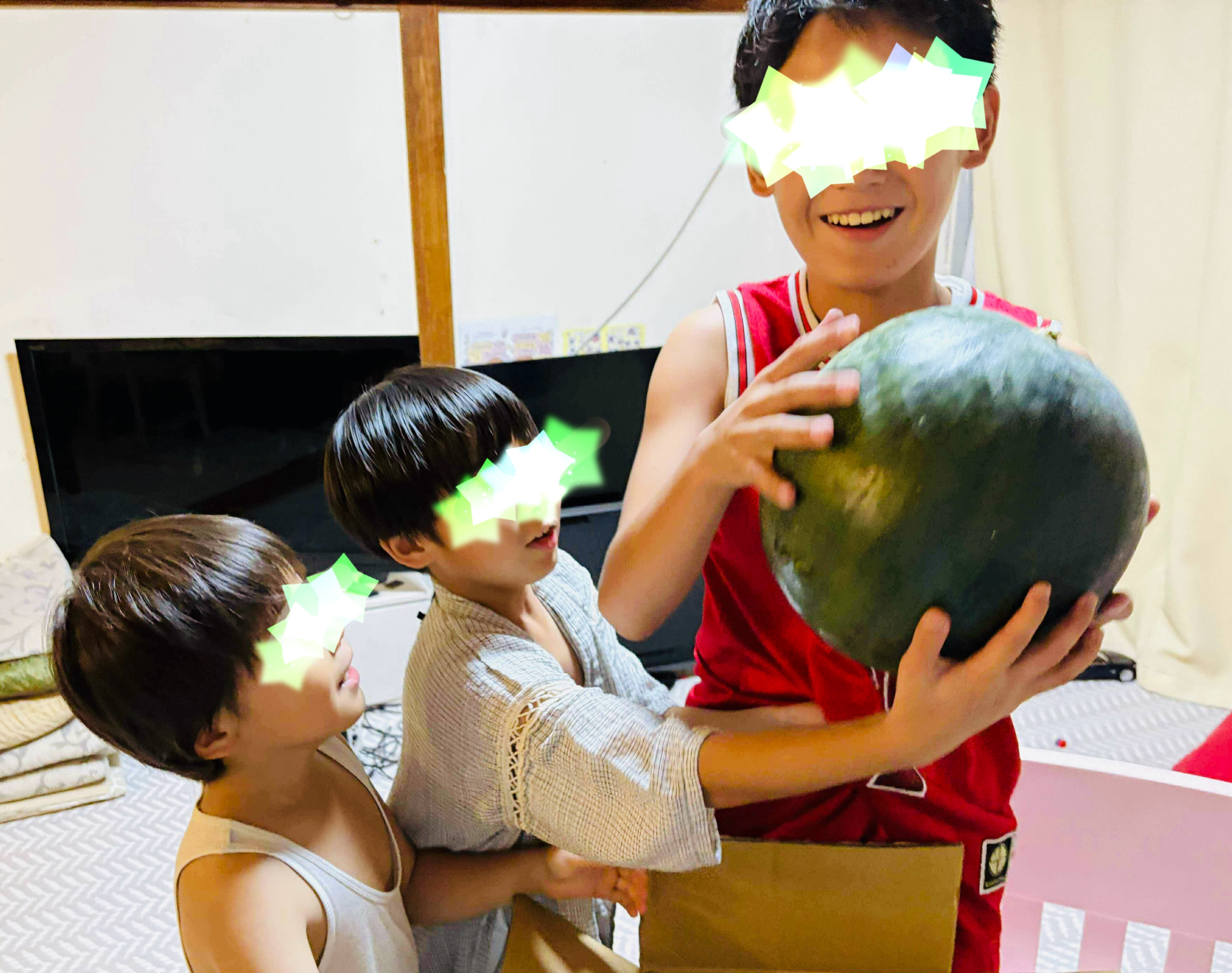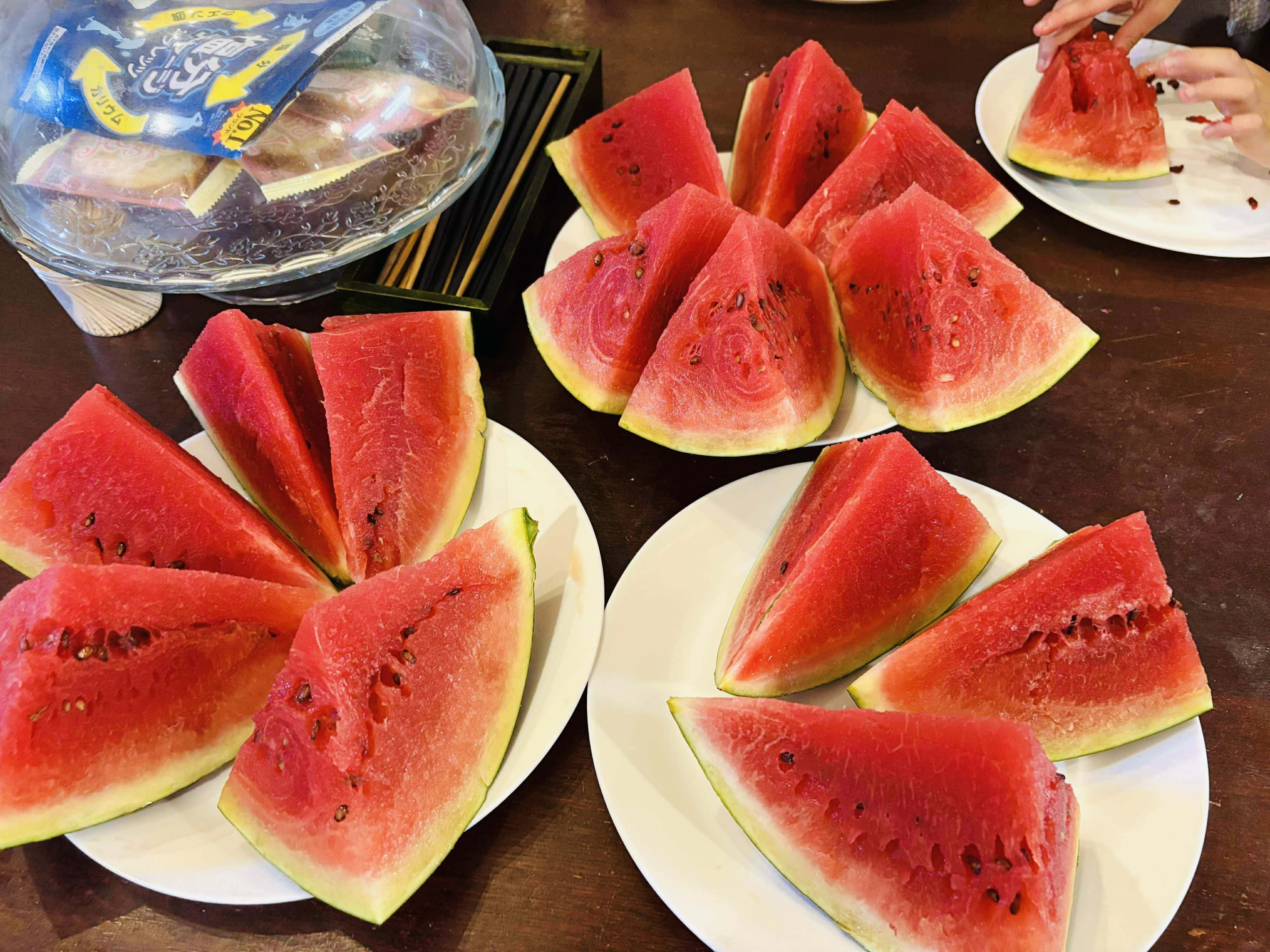 プライベートで自然栽培をされている支援者さんから、野菜だけでなく今月は大きなスイカが送られてきました。