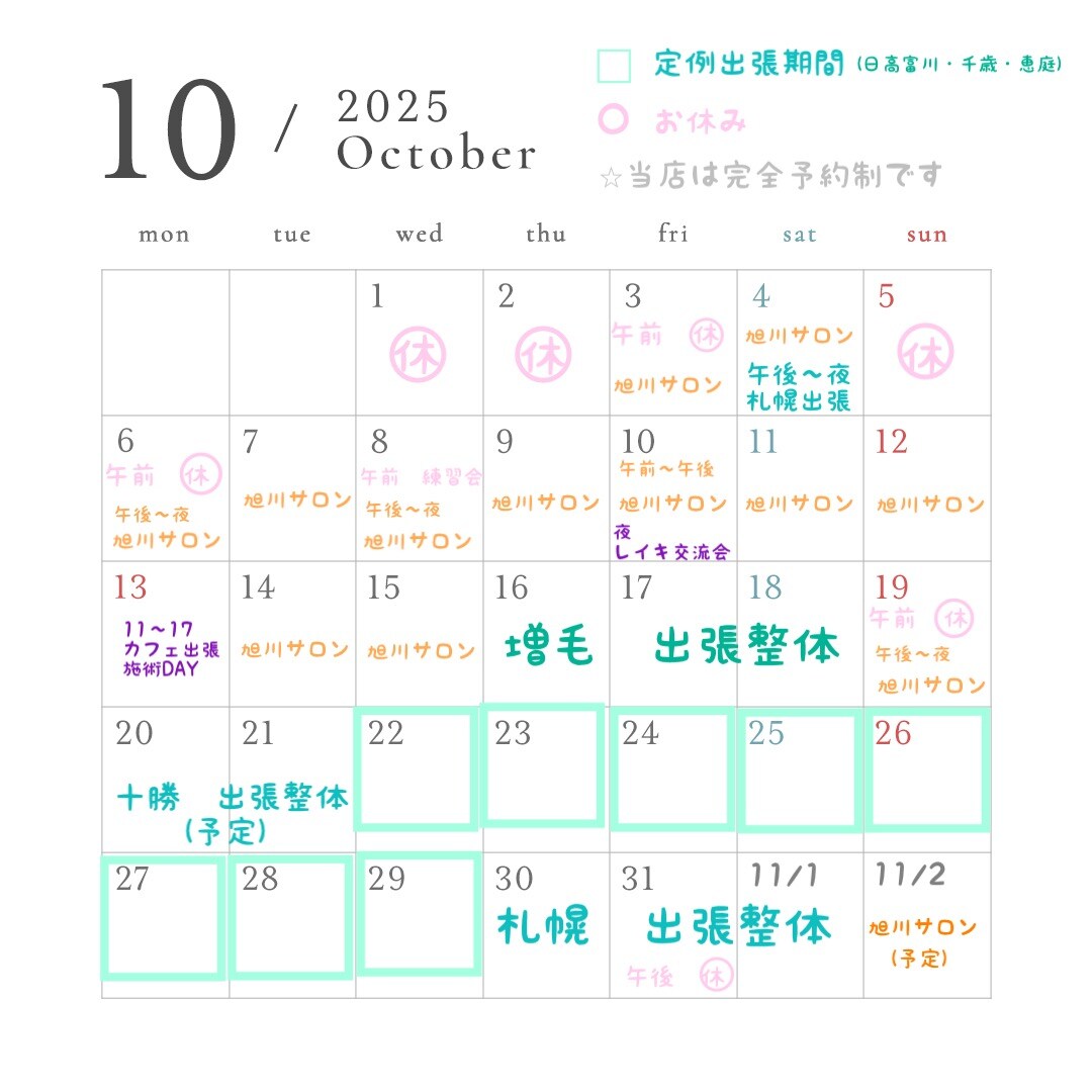 10月のHarmonyは雪が降る前の出張を多く計画していて、旭川サロンでの予約可能枠が少なめです。