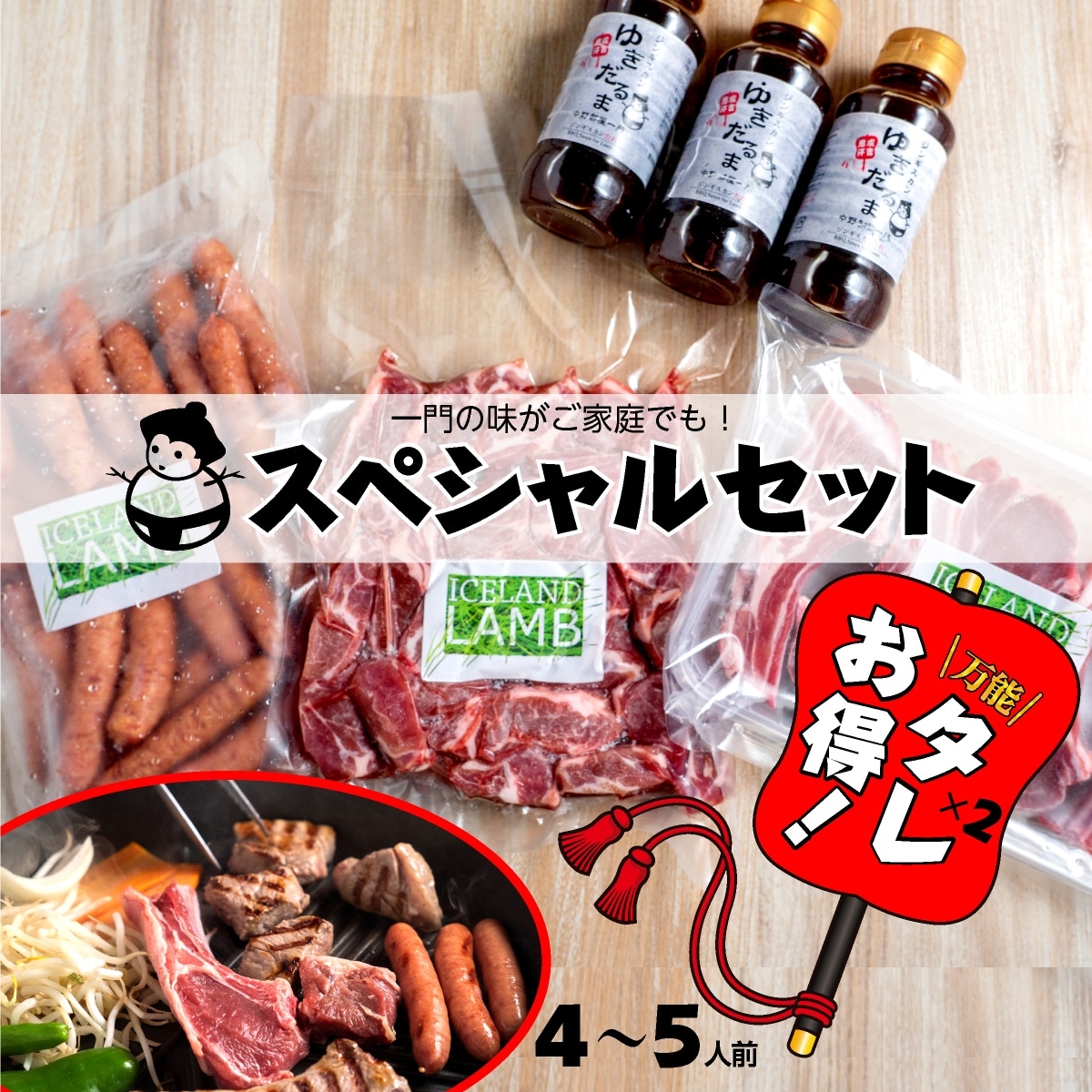 アイスランド産ラム肉(肩ロース)が約500g、アイスランド産ラムチョップが約300g(5本)、アイスランド産ラムソーセージが約500g(20本〜25本入り:1本20〜25g)、ゆきだるまオリジナル醤油タレ×3本がセットになっております🎁