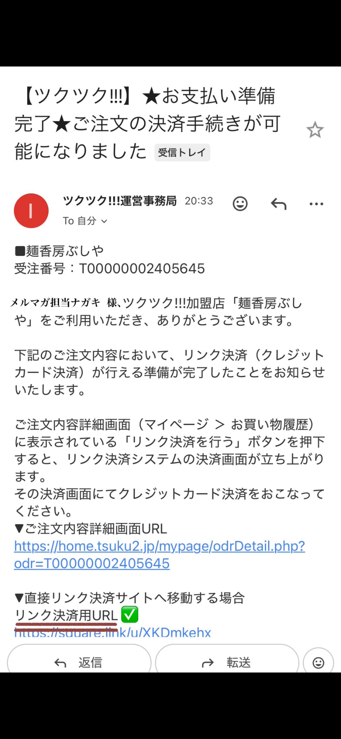 ④ 「ご注文確認メール」と「★お支払い準備完了★」のメールが届きます。「★お支払い準備完了★」のメールにある「リンク決済用URL」より、「Square」のページに移動して必要情報を入力して決済します。