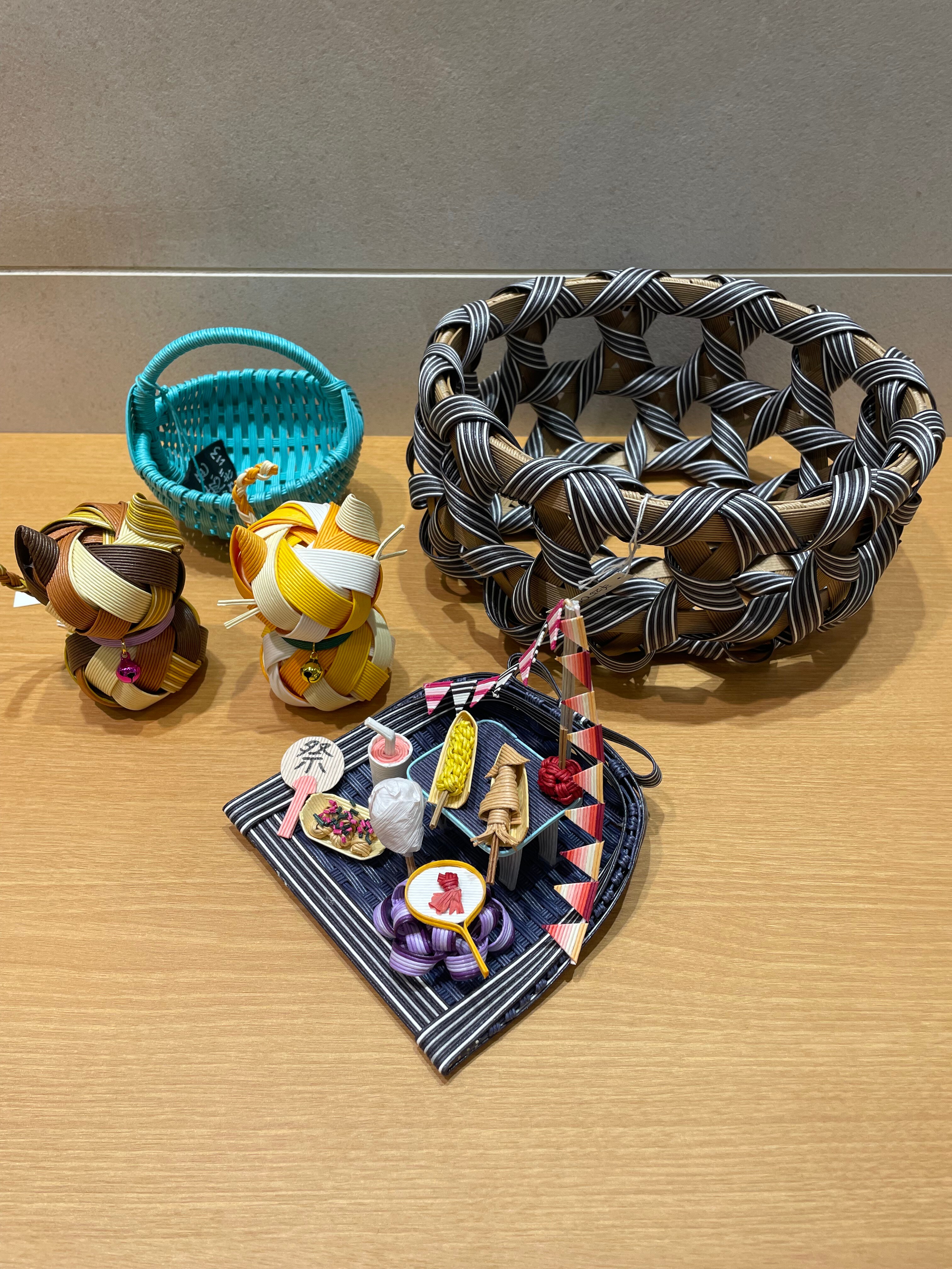 再生紙の紙バンドを使用し、季節のミニチュア飾りやコロンと可愛い丸カゴなど彩り豊かな紙バンド作品をお持ちします。
