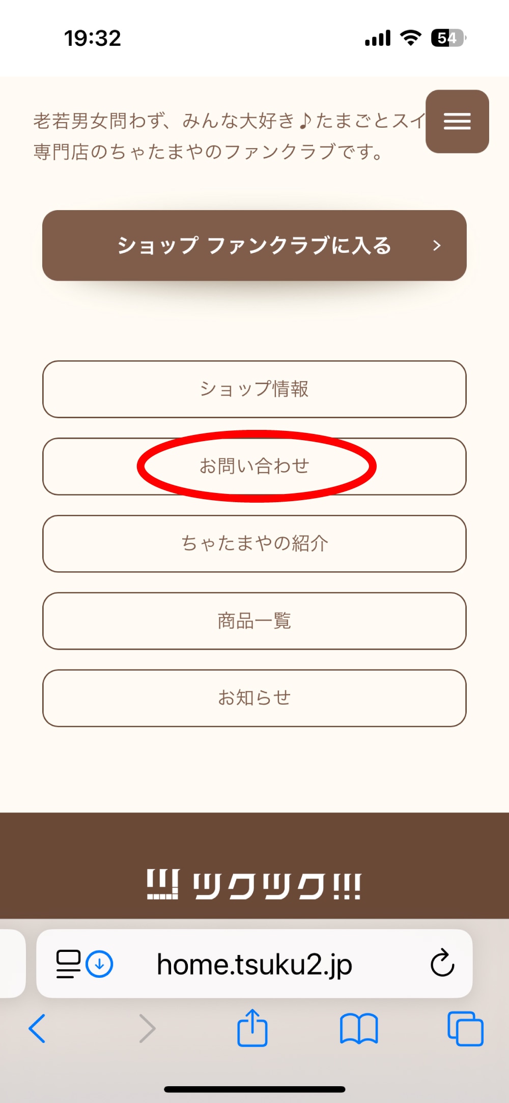 申込みはお電話の他、ツクツク!!!ちゃたまやの総合ページ内、一番下にある【お問い合わせ】からもできます。