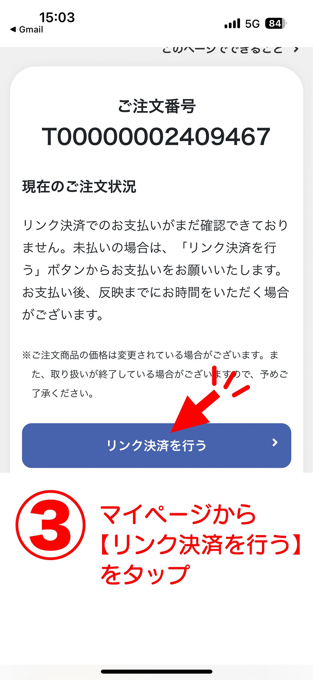 ⬇️マイページ内のお買い物履歴→ご注文内容詳細画面に表示されている「リンク決済を行う」ボタンを押下すると、リンク決済サービスに移動します。
