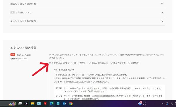 1.お支払い方法の選択で「リンク決済(クレジットカード決済)」を選び注文を完了する