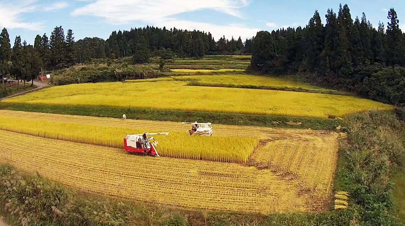 田圃ではホタルが飛びメダカが泳ぎ、秋には赤とんぼが飛び交う自然環境で稲刈りをしています。