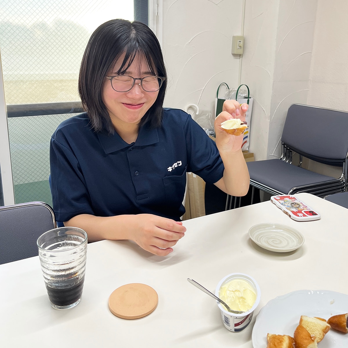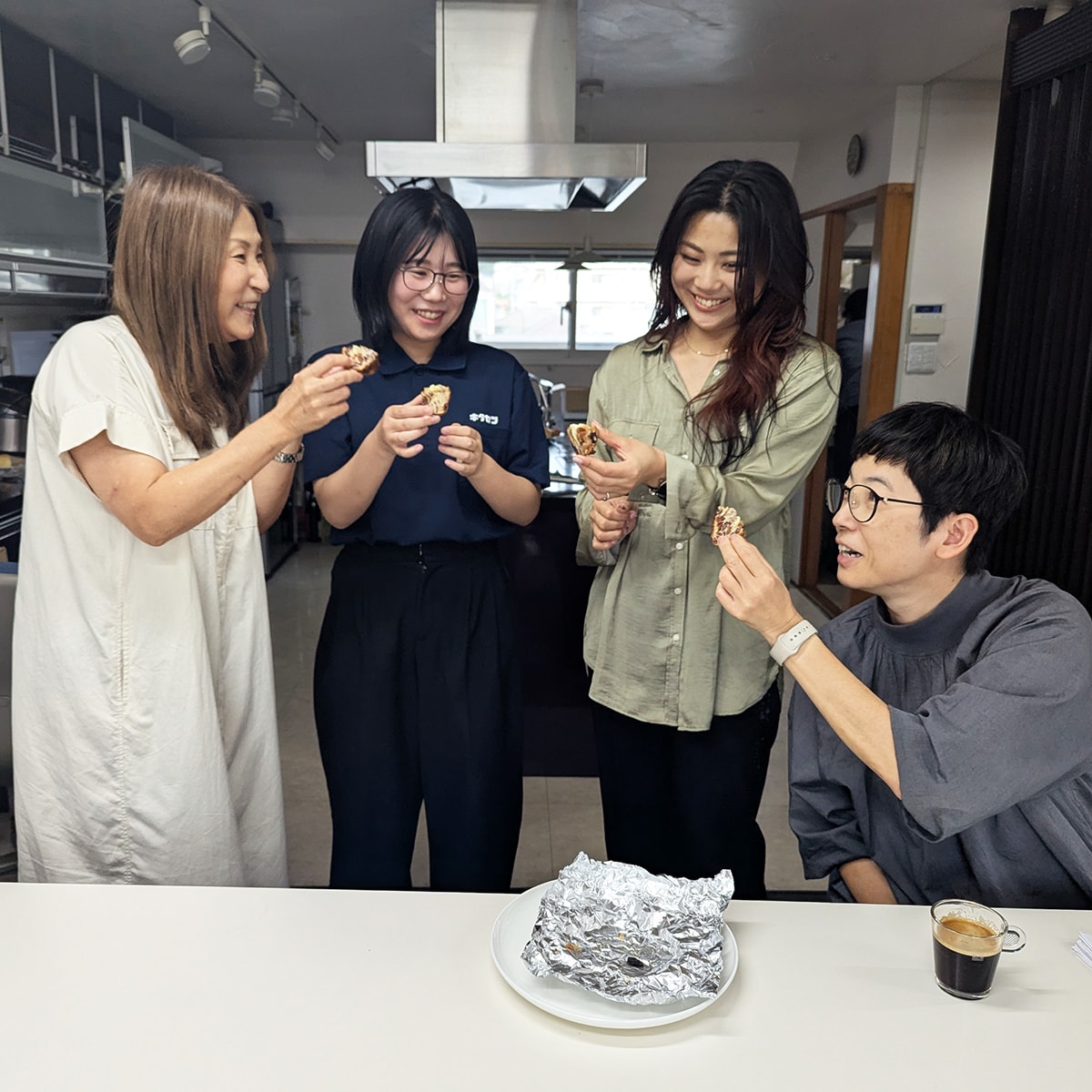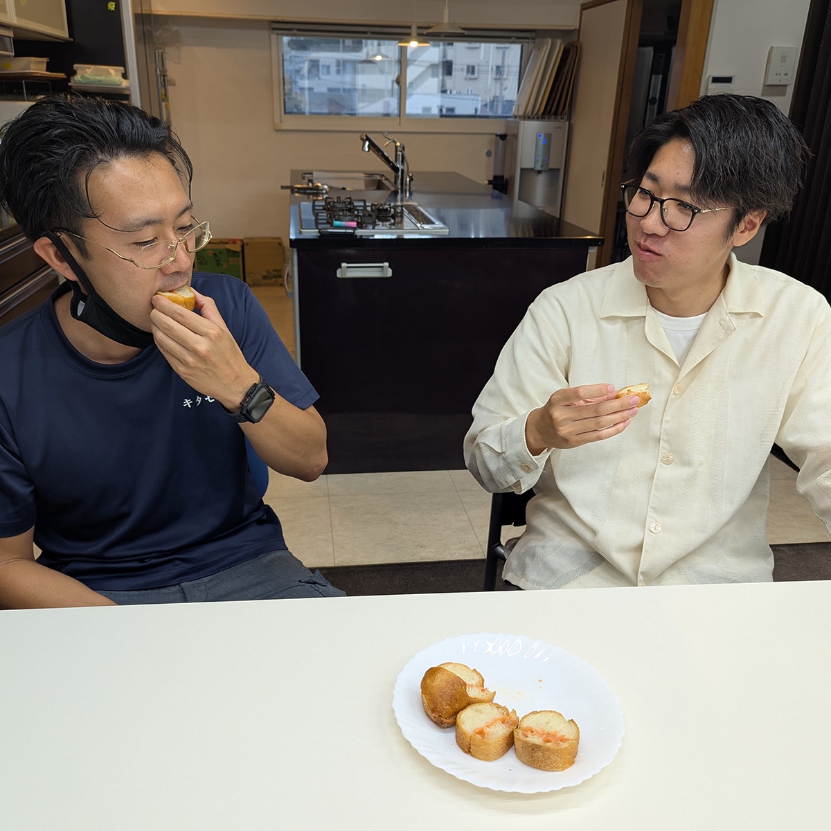 内装担当・久保も一口。夕方のちょうど小腹が減る時間帯のパンの試食はみんな満足そう。笑顔で仕事に戻っていきました。