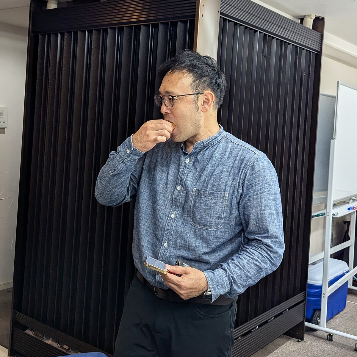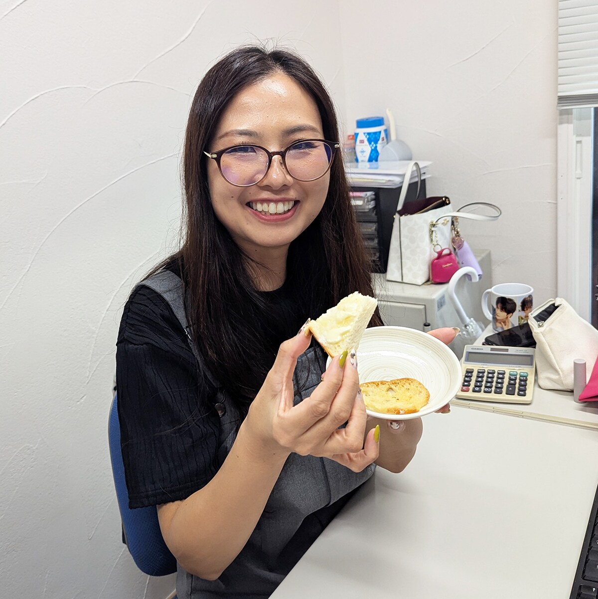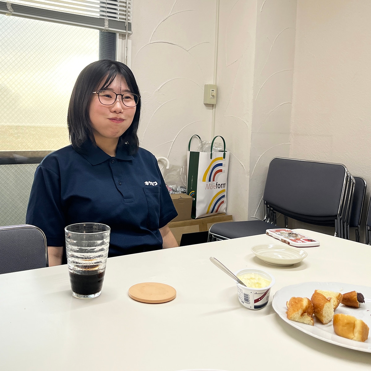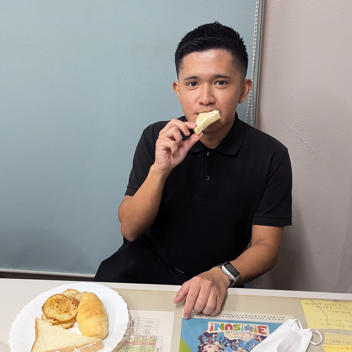 内装担当・久保も一口。夕方のちょうど小腹が減る時間帯のパンの試食はみんな満足そう。笑顔で仕事に戻っていきました。
