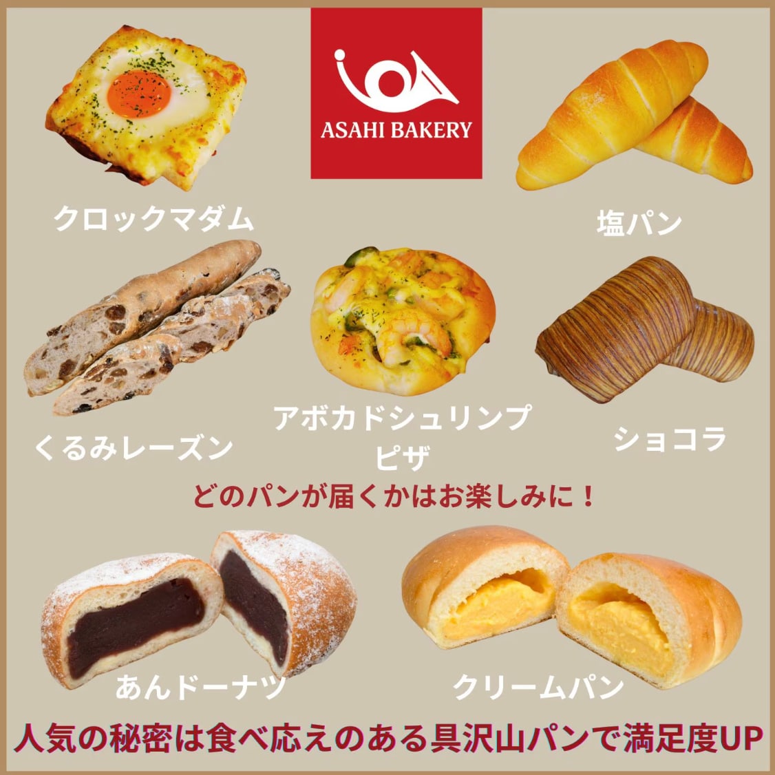 角食パン、バタール、あんドーナツ、クリームパン、塩パン、ロールパン、レーズンパン、カレーパン、クロワッサン、パンスイス、ベーコンエピ、クロックムッシュ 等