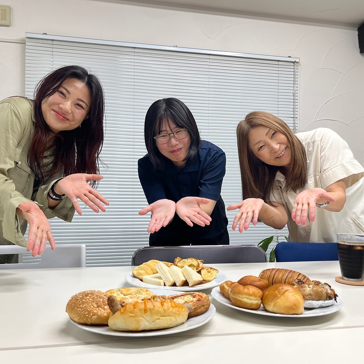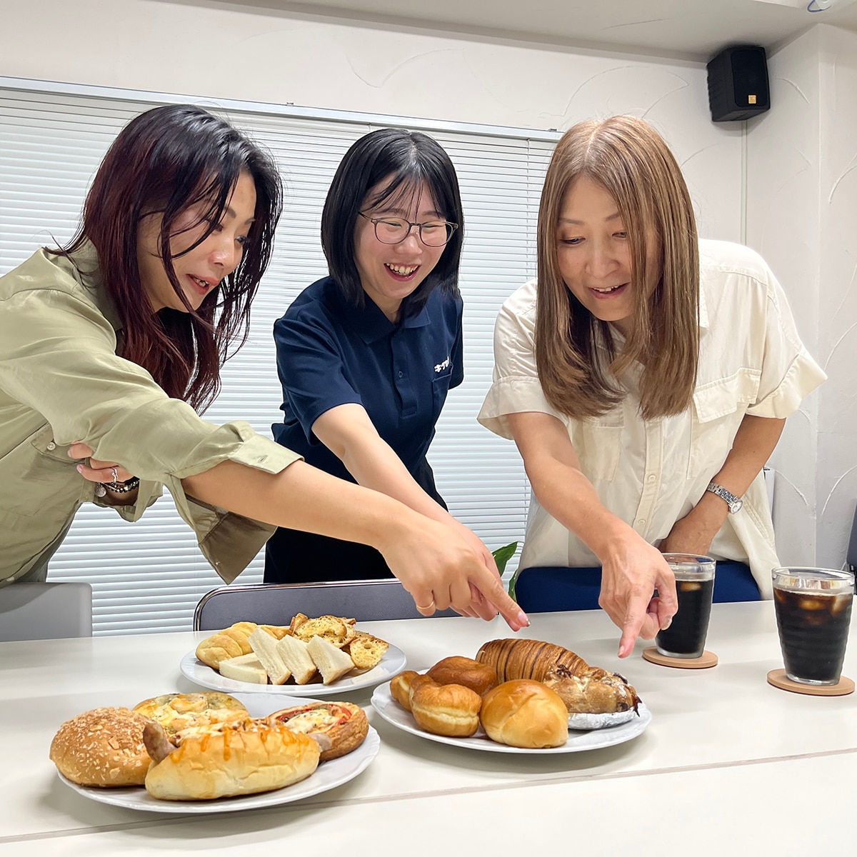 プランナー・玉島と内装担当・岸が嬉しそうに集まってきました。塩メロンパンにアンドーナツ、カレーパンやピザパンもあって目移りします。