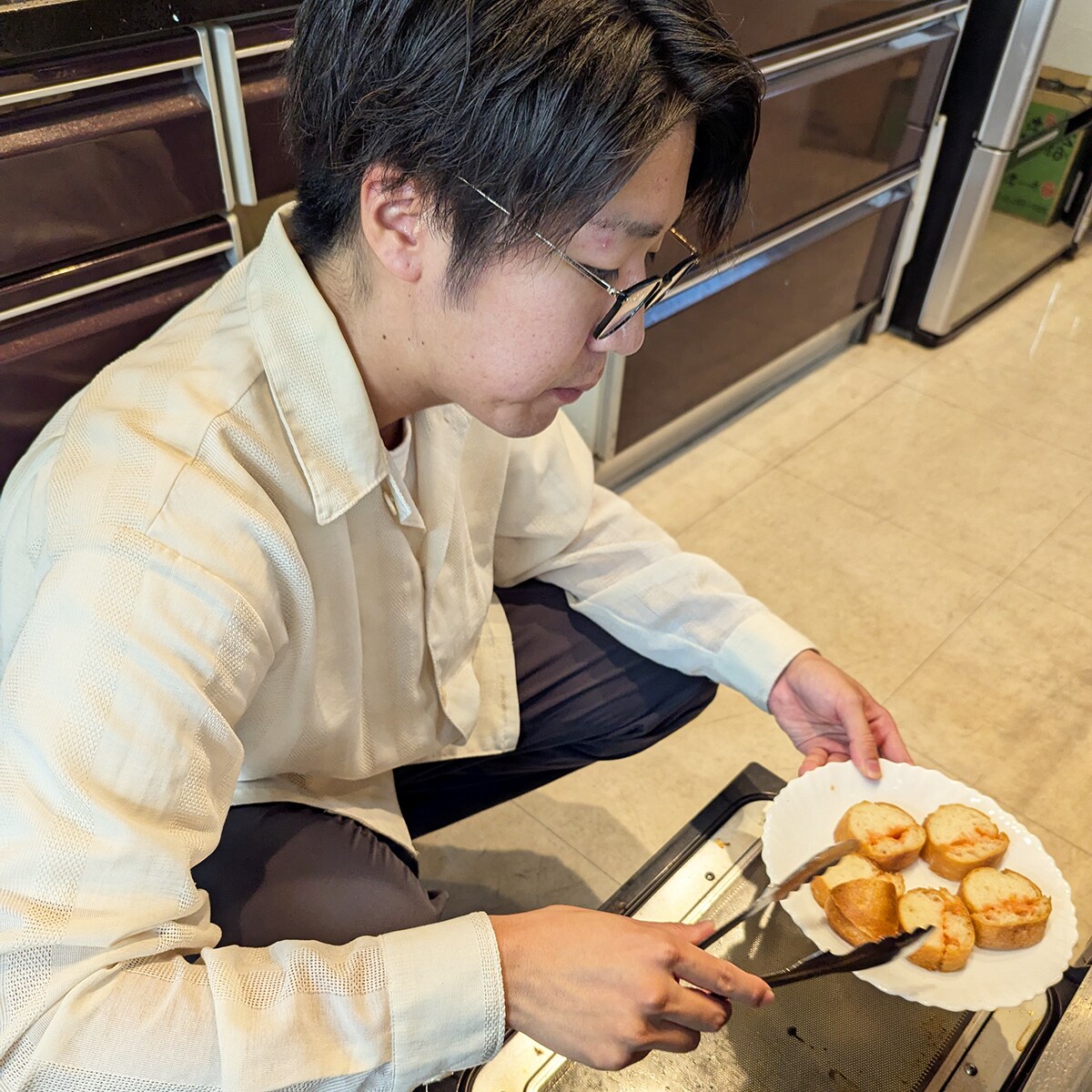「ガーリック明太?おいしそうですね!」と外装担当・小森がガスオーブンで温め始めました。