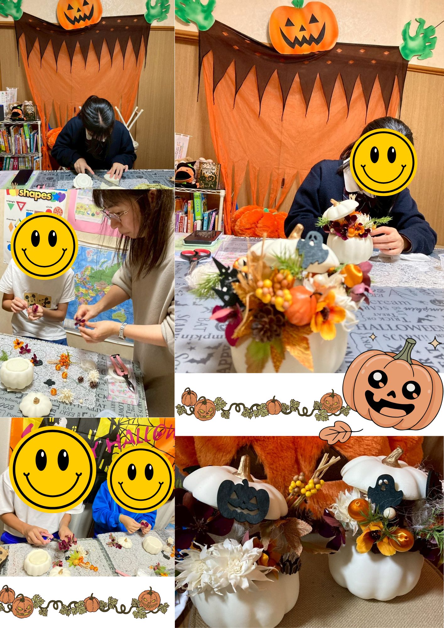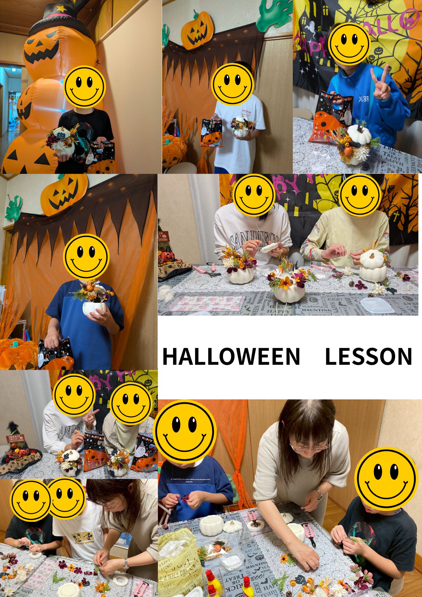 そして、みんなが楽しみにしていたハロウィンレッスン!!!ニコニコだ賑やかだと思えば、突然集中して静かに無言で作業を進むていたり・・・。皆さん個性溢れる素敵なオブジェが完成しました。残念ながら参加できなかった方々には11月のレッスンの中で短時間でできるような内容を準備します。
