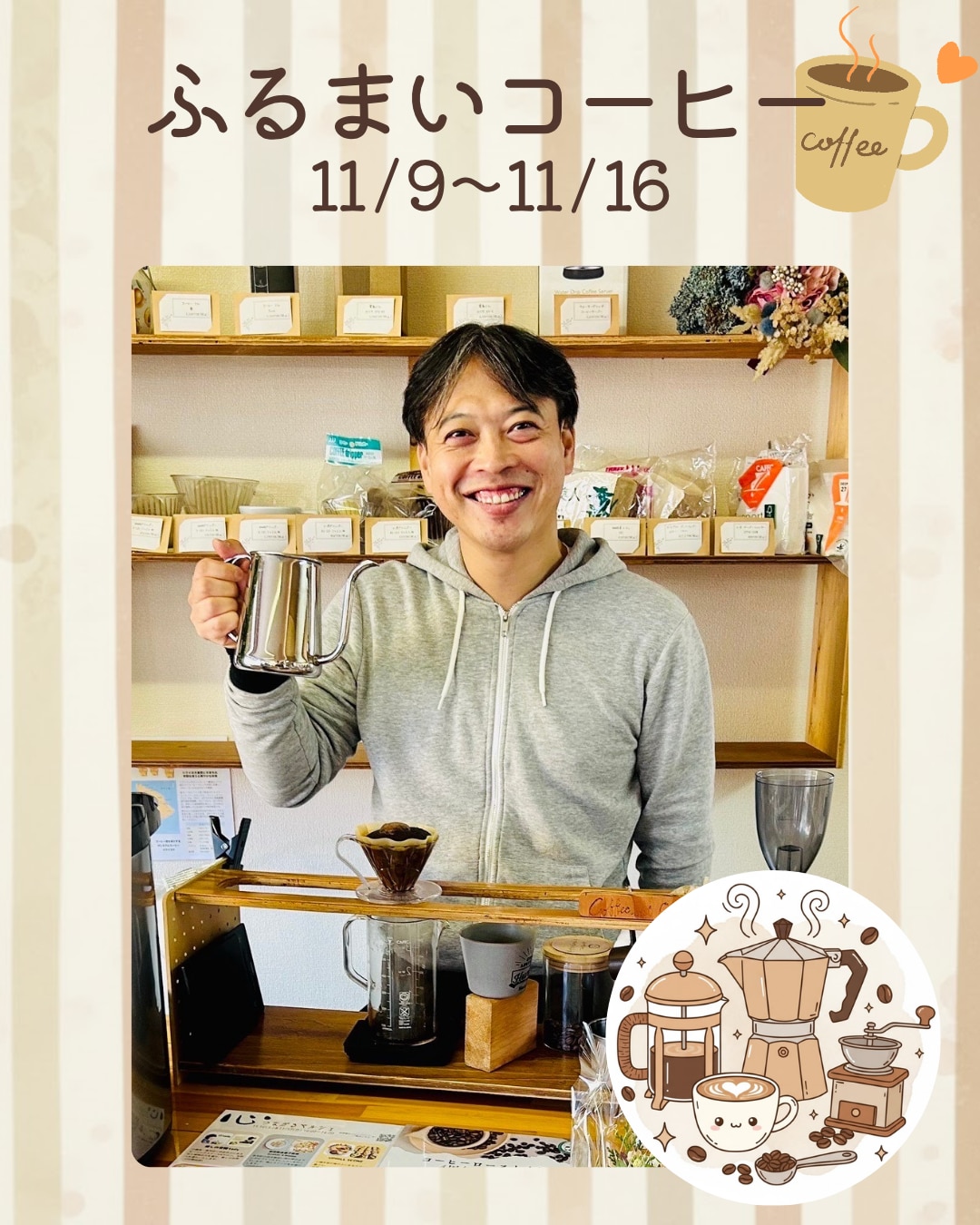 11月9日(日)〜16日(日)の期間中、ご来店いただいた方に「テイクアウトコーヒー」を無料で提供します。(店頭のみ)