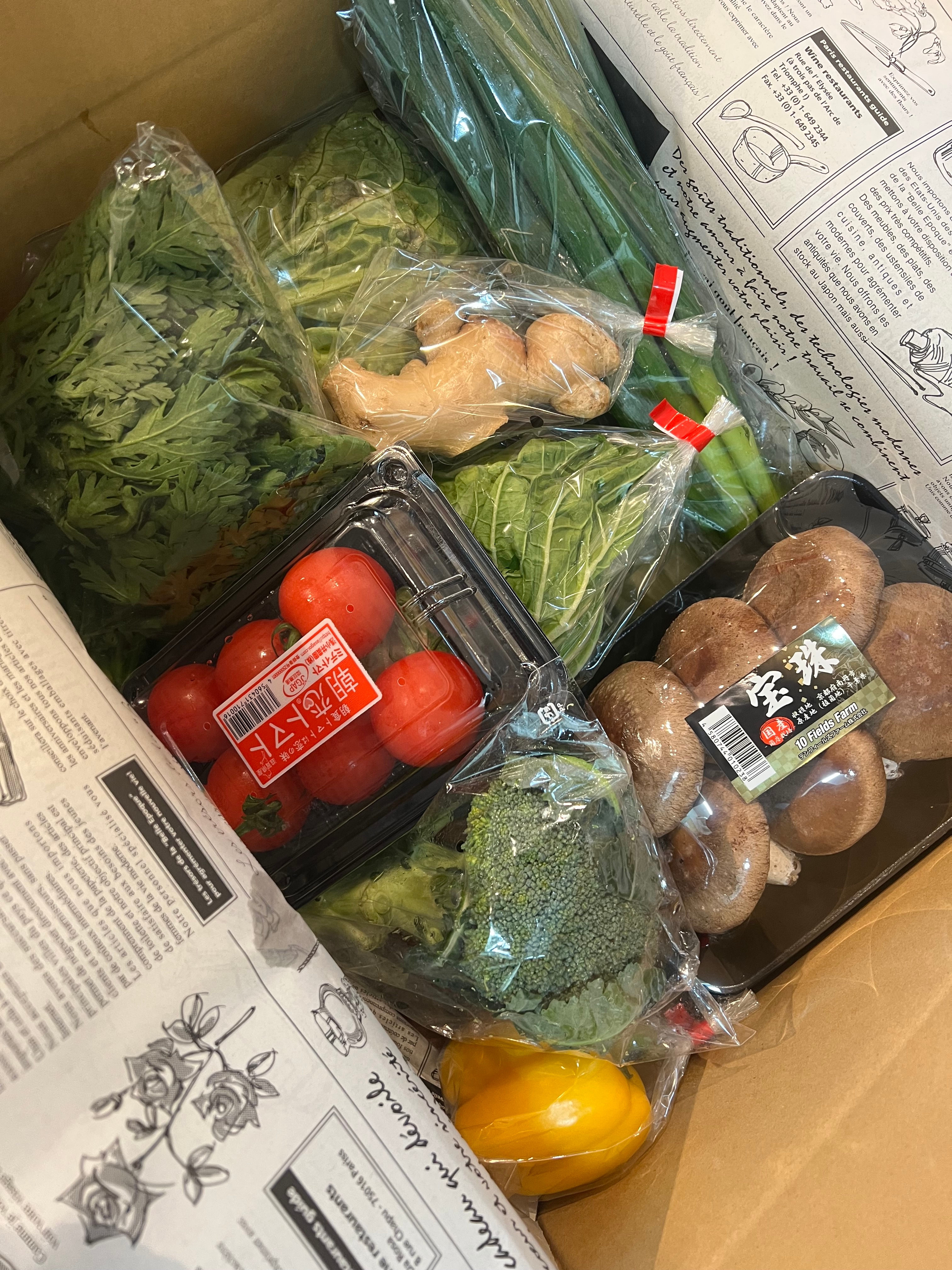 本日発送は定期便のお客様に、今回は鍋物料理の野菜とサラダ野菜のセットで下には葉付き大根とミニ白菜が入ってます。