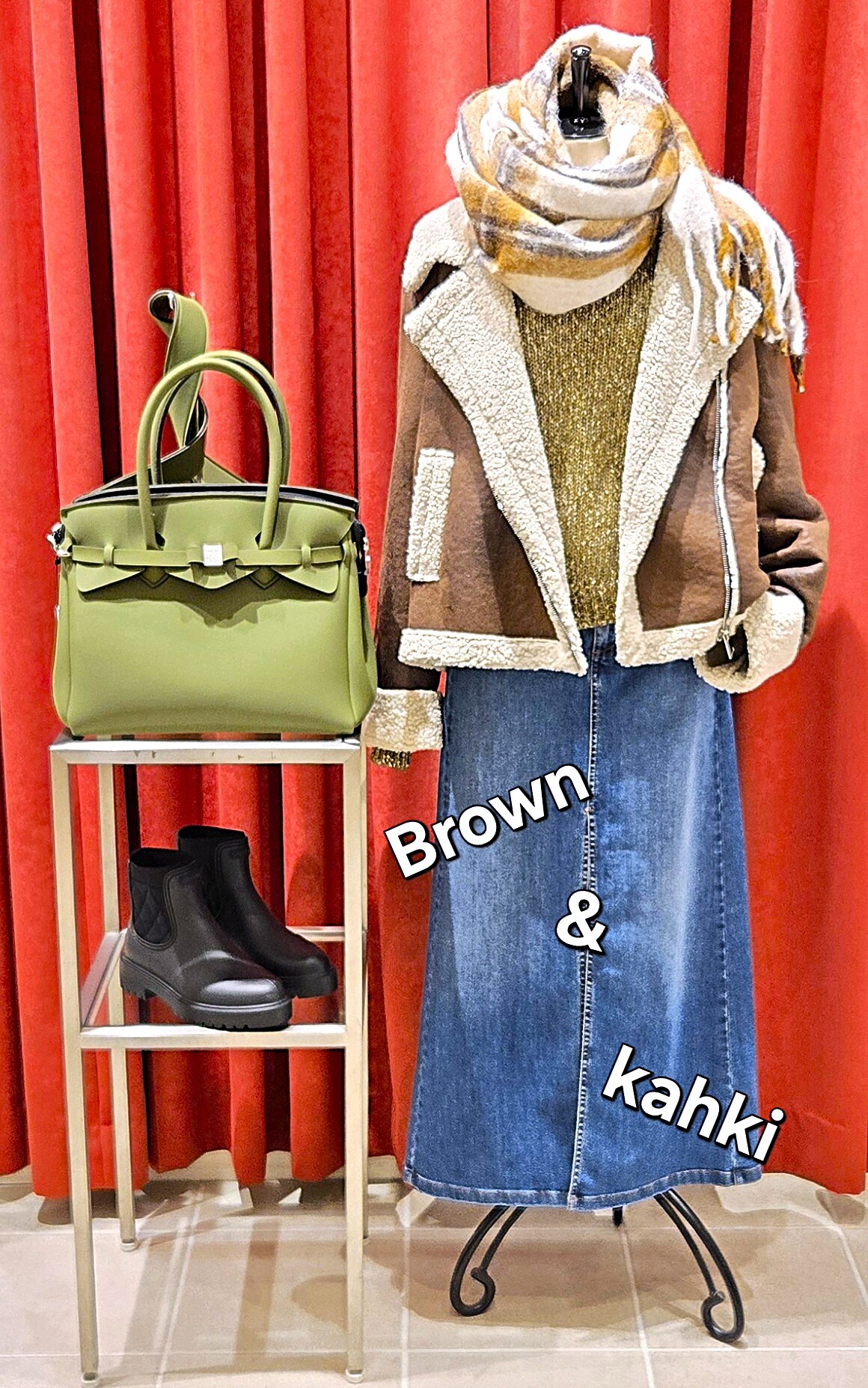 インナーのセーターもカーキ&アイボリーのMIX糸が表情があって、1枚さらりと着るだけでスッキリおしゃれ❣️ パンツ合わせでも⭕