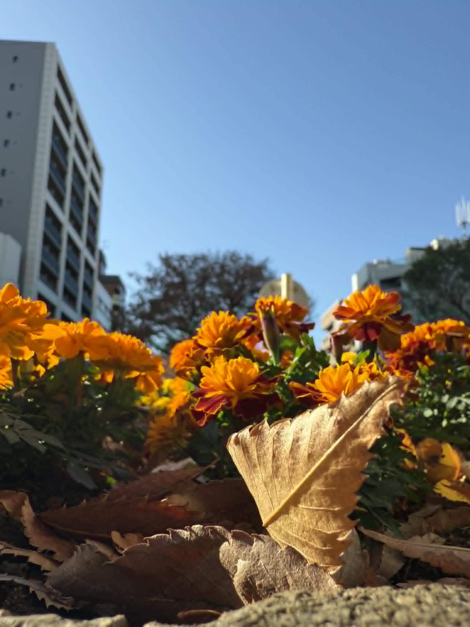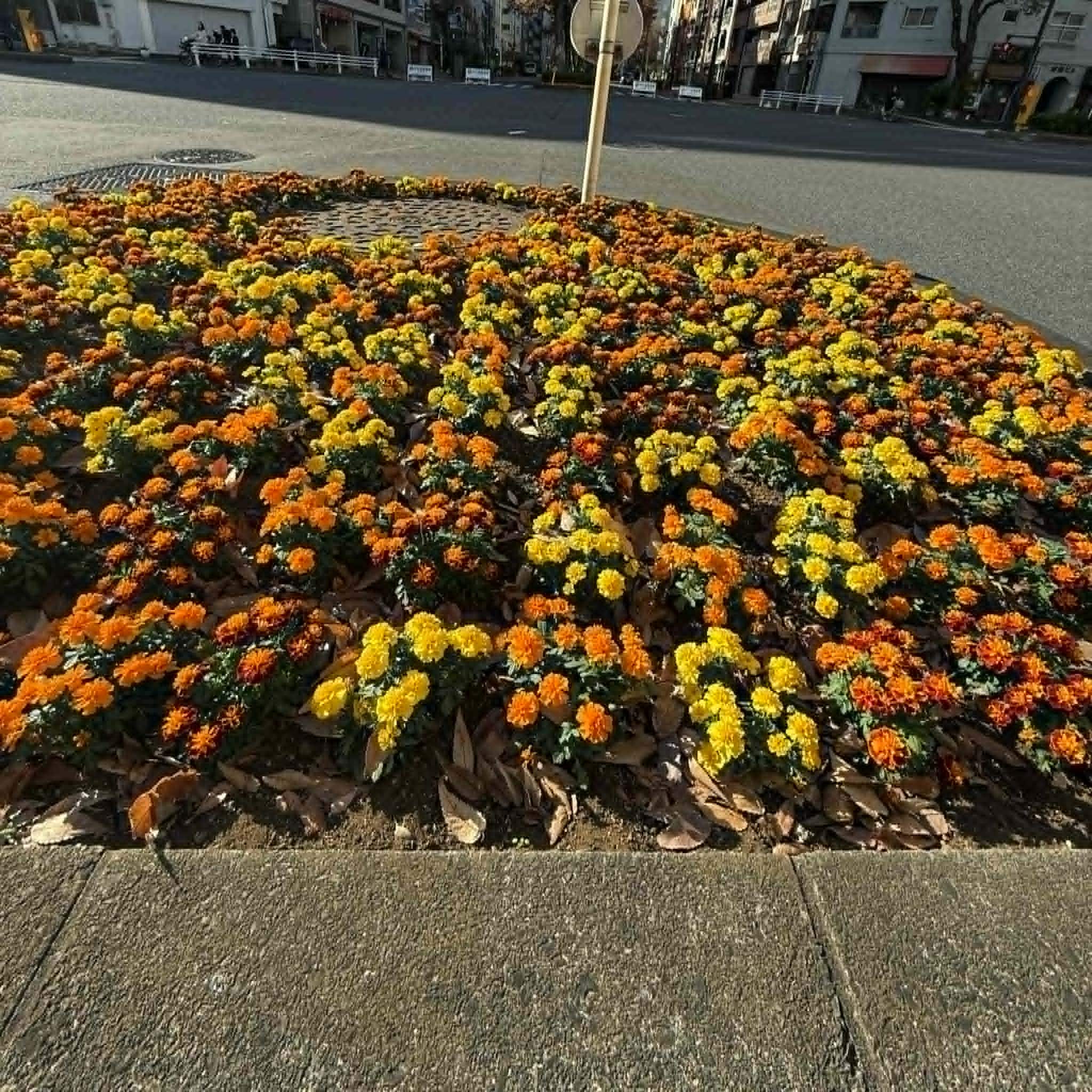 日曜日は《歩行者天国》になる道があります。交差点の一角にお花畑。秋なので枯葉も同席。