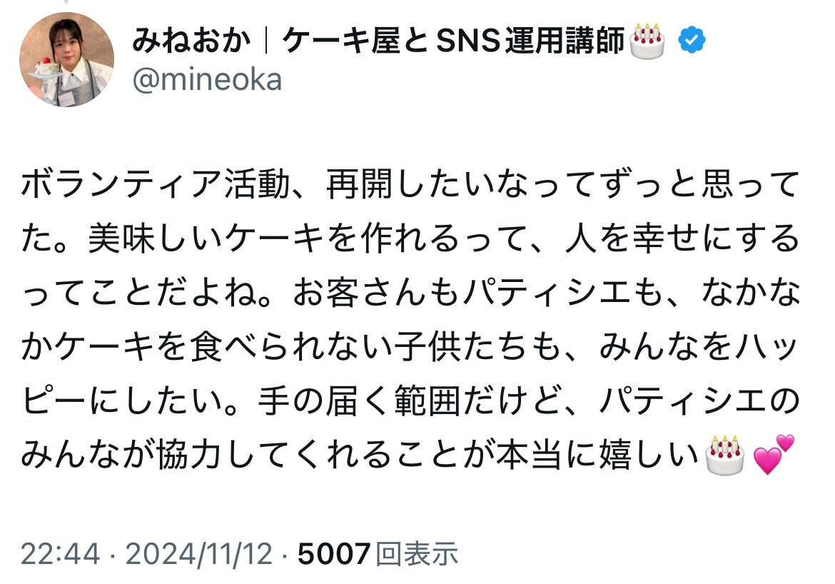 (ボランティア活動とは書いてありますが、私はきちんと対価をお支払いし、ケーキを購入させていただく所存です。)