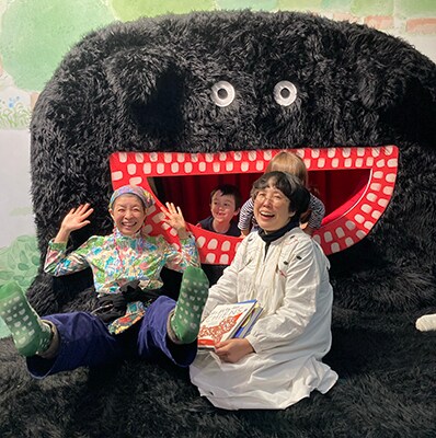 会場にあった遊び場?ではしゃぐ私とニジノ絵本屋のあやさん