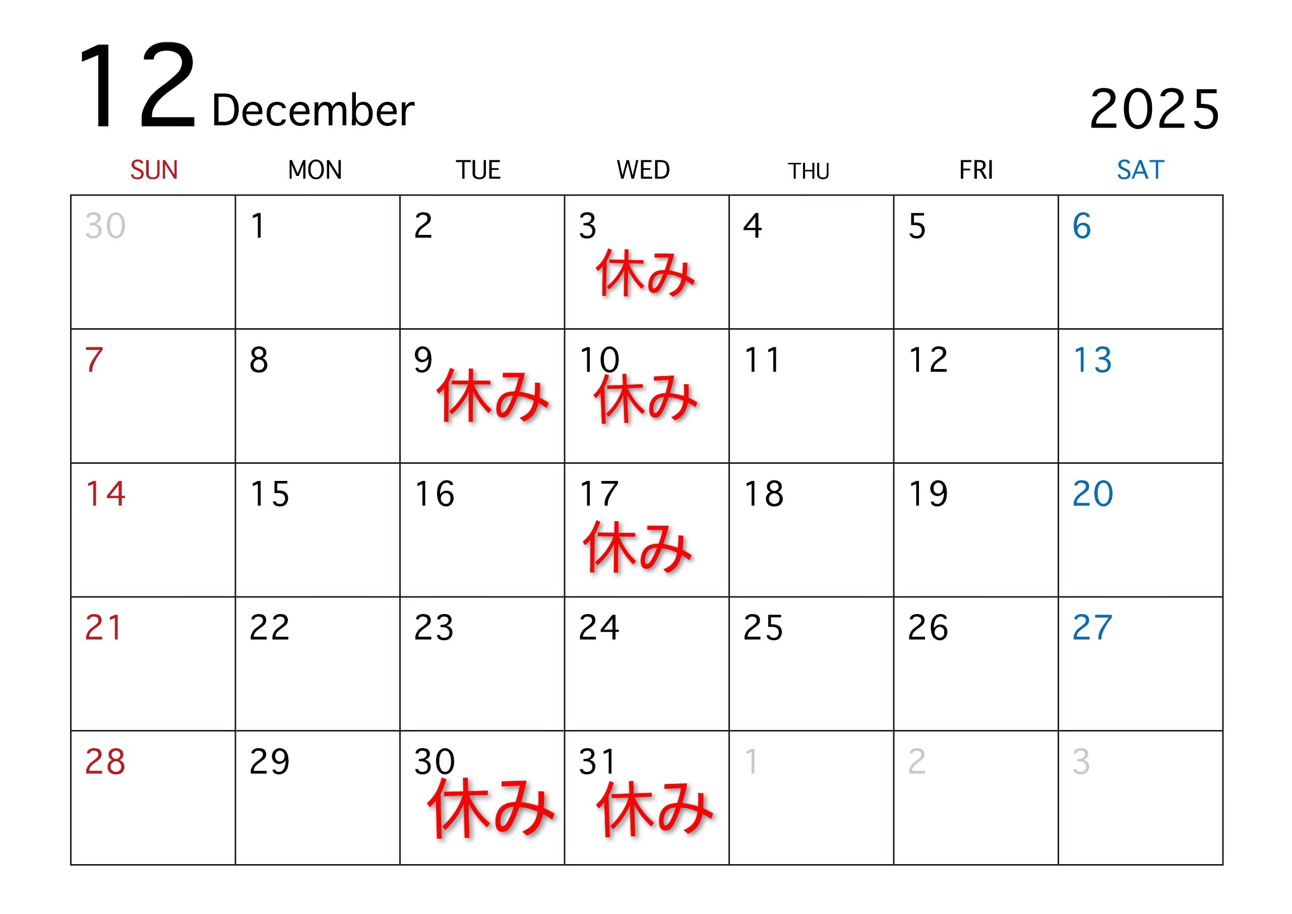 12月の休みです。