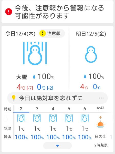 雪国新潟は、大雪注意報が出されています。
