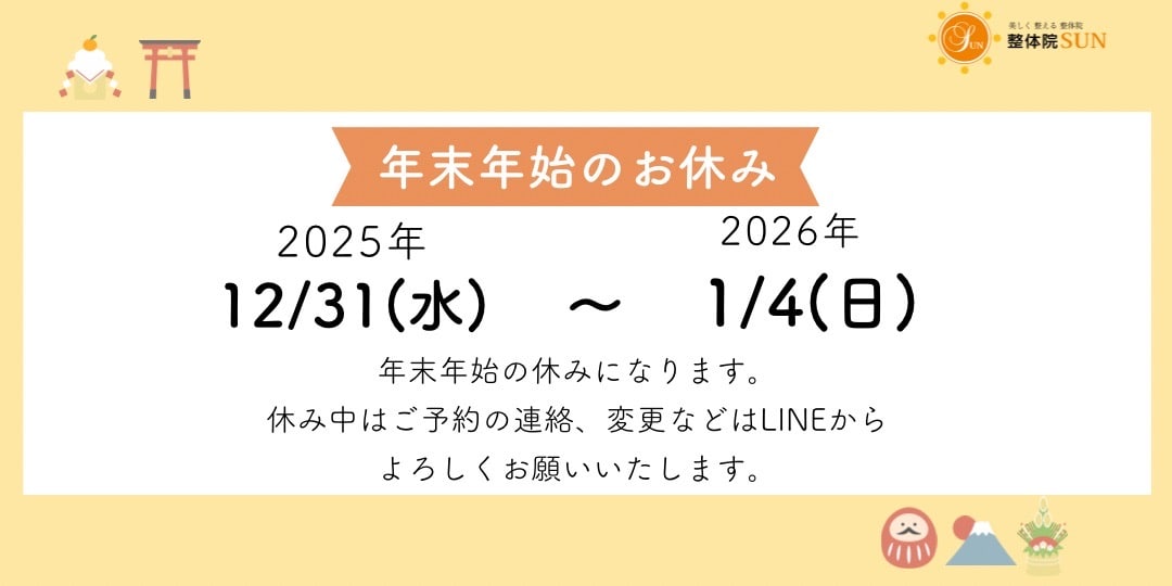 ※1/3(土)は15時までの受付になりますが、整体のみ営業させていただきます。