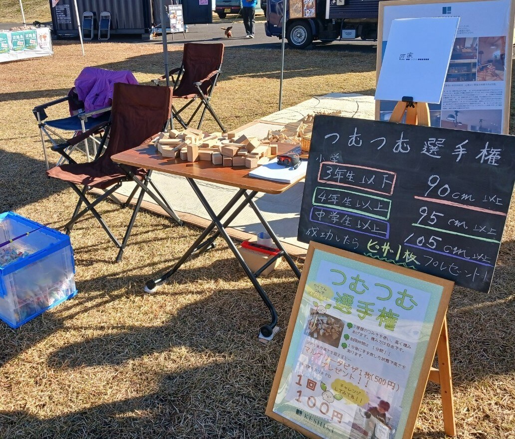 国産材を使用した積み木、木質バイオマス燃料を使用したペレット窯で作るピザ。