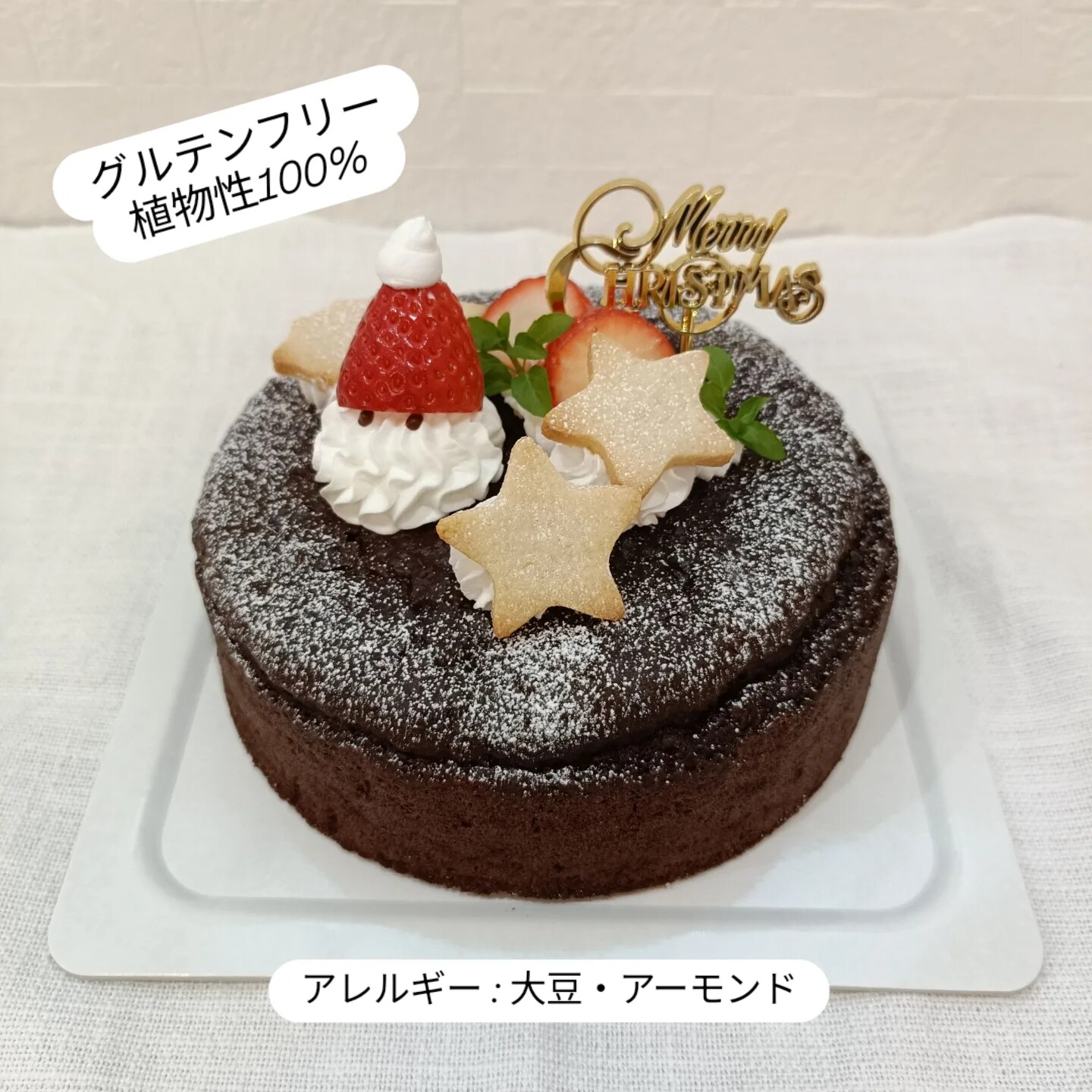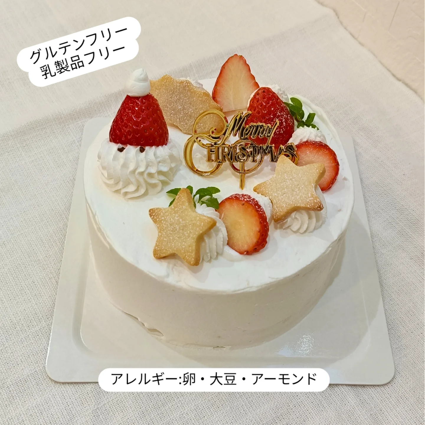 都城市めんどり家さんの平飼い卵、自然農園こころさんの自然農米粉を使用したふわふわシフォンケーキに、豆乳ホイップに苺と米粉クッキーを飾ったクリスマスケーキです。