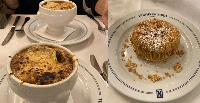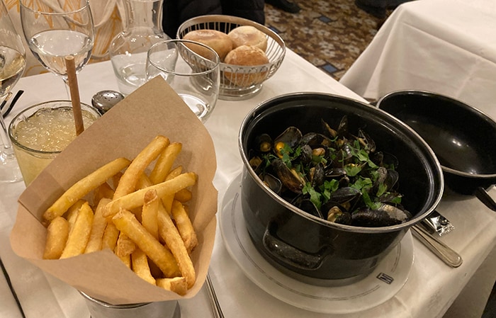 本場のオニオングラタンを食べてみたかったのです。美味しかったです。あと、みんなでムール貝をシェア。