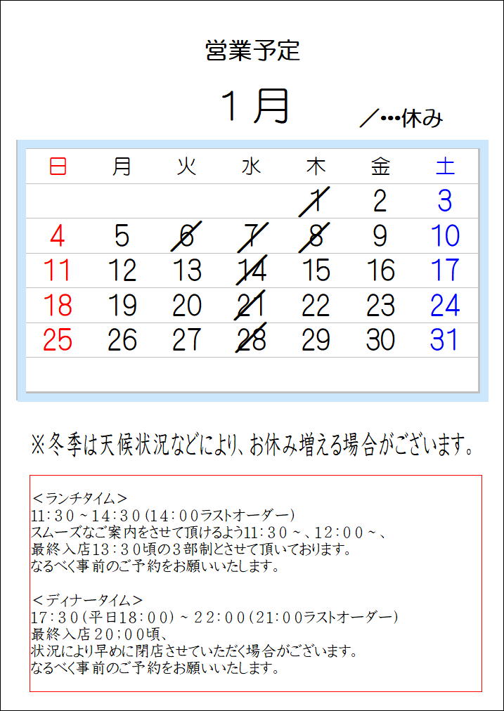 1月の営業予定↓