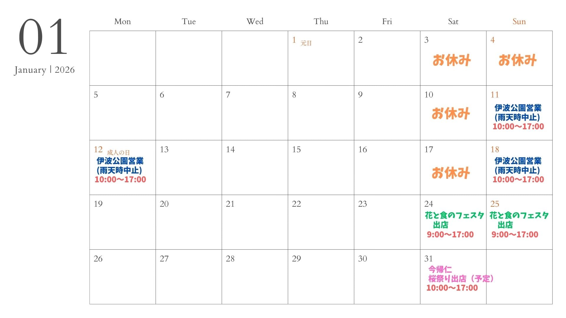 【お知らせ】2026年1月のキッチンカー出店スケジュール