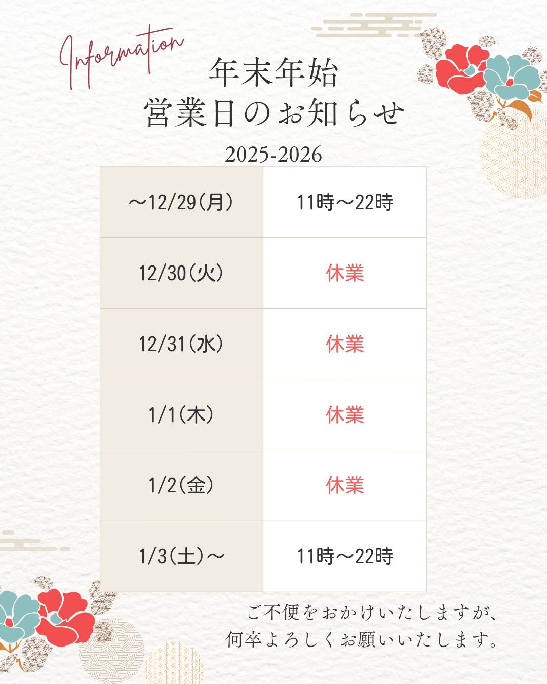 年明けは 3日㈯からの営業開始となります。
