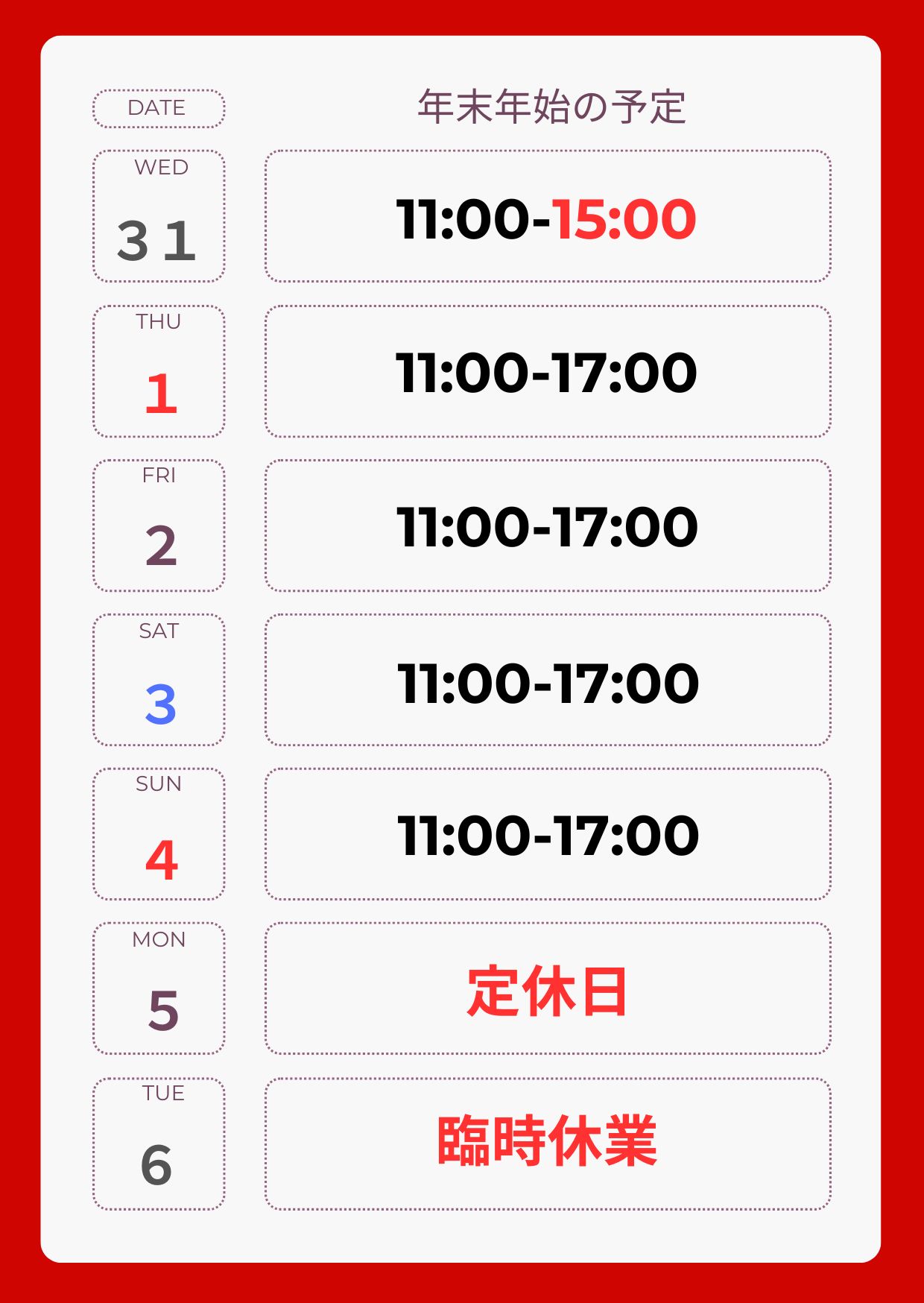 6日は臨時休業しますが7日以降は11時-17時で営業します。
