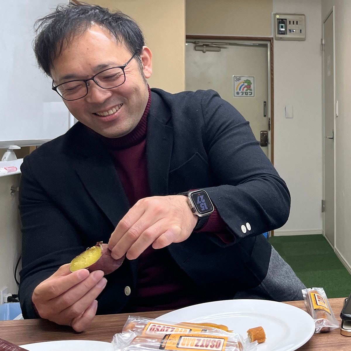 お芋関連のイベントやお芋のスイーツカフェに出かけることもあるという、さつま芋が大好きな内装担当・鳥羽部長。待ってました~とばかりに、一通り食べて「おさつバー、おいしいなあ。シナモンが入っているからかなぁ~レーズン風味も感じて、大人が楽しめる美味しいおやつだね」と満面の笑み。