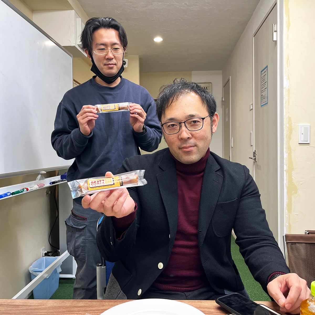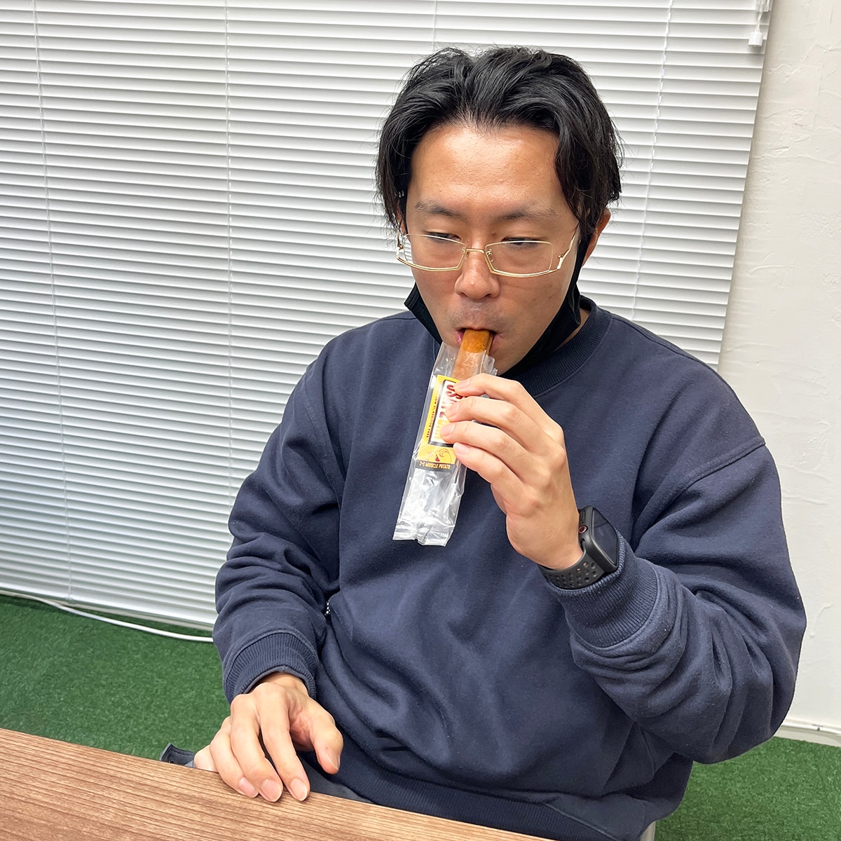 「久保さん、ひとついかがですか?」と筋トレ仲間の竹内から、おさつバーを渡され、