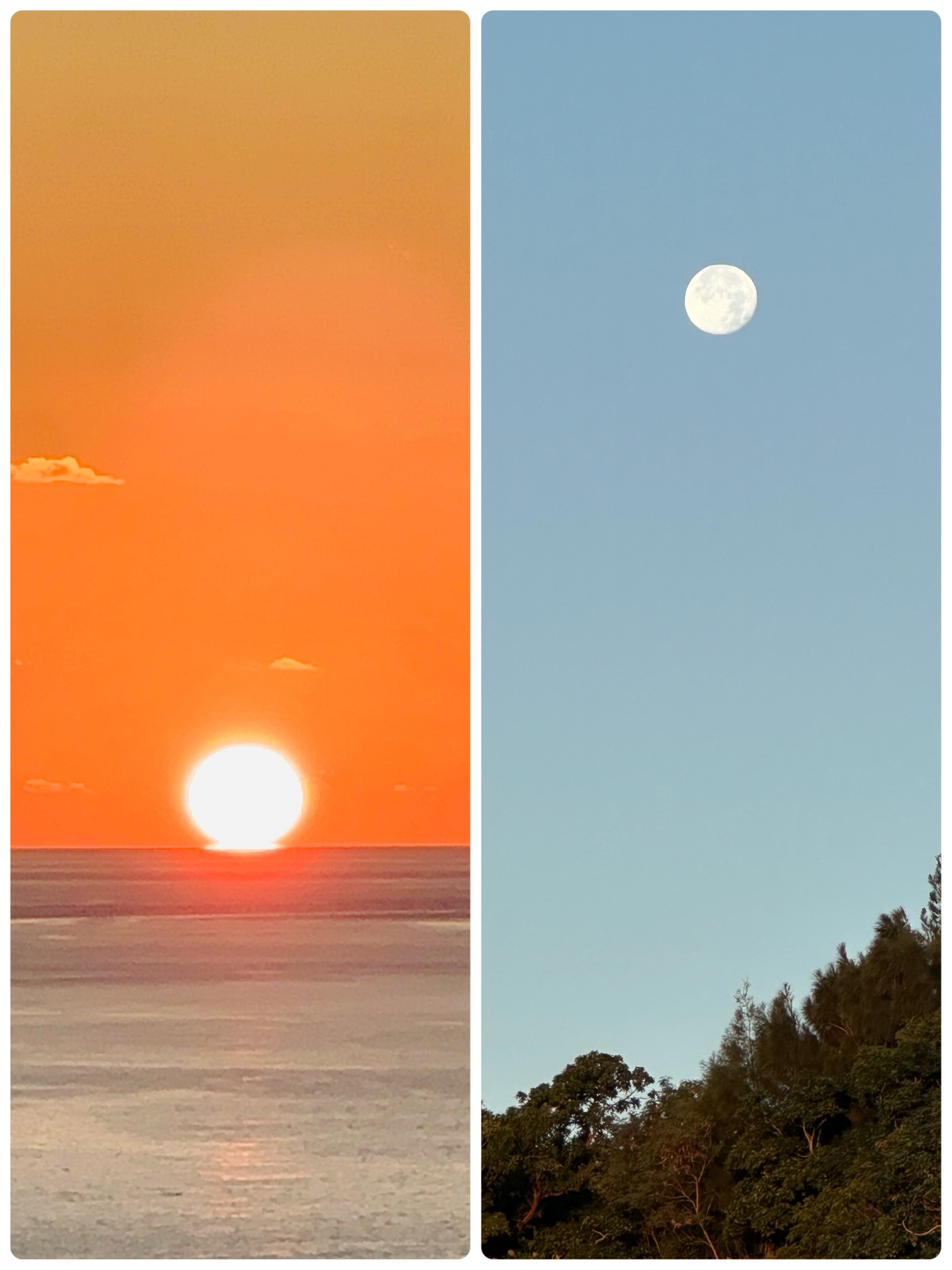 振り返ると、ジャングルに覆われた「斎場御嶽」の山があり、十六夜の月がその山の向こうに沈んで行くところでした。